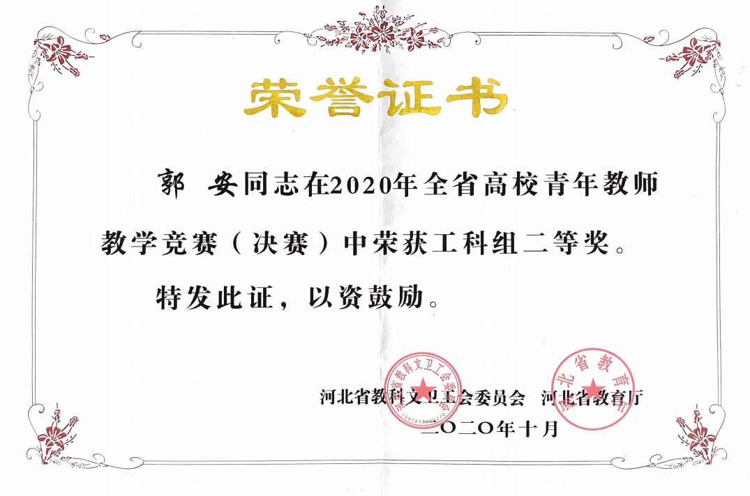 由河北省教育厅、省教科文卫工会联合举办的“2020年河北省高校青年教师教学竞赛(决赛)”于9月2日至4日举行,来自华北电力大学、河北工业大学等全省52所本、专科院校的97名青年教师进行了同规则竞技。我院艺术与传媒系教师郭安经学院推荐和市教科文卫工会的选拔,作为我市五名代表之一参加了本次竞赛,并荣获最佳成绩二等奖。