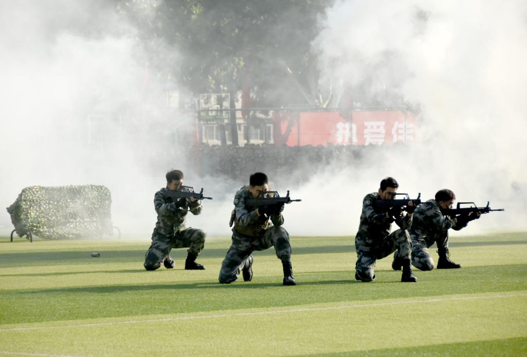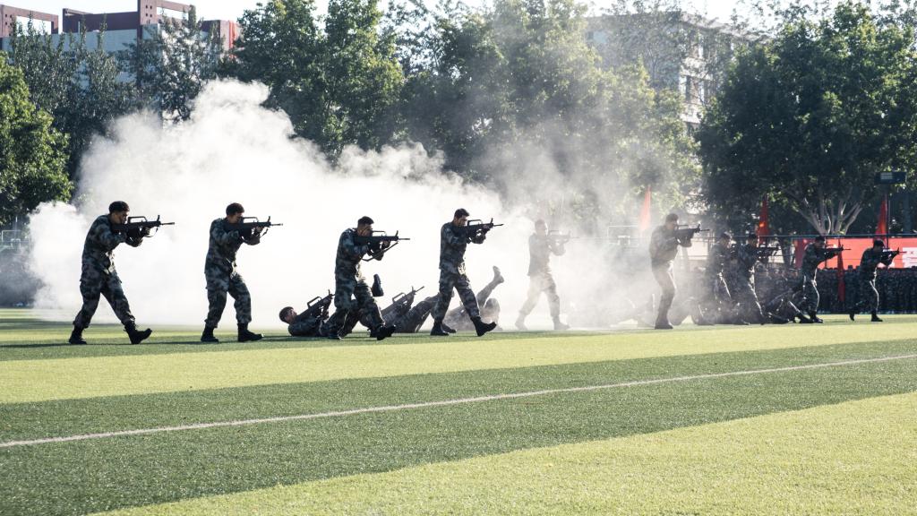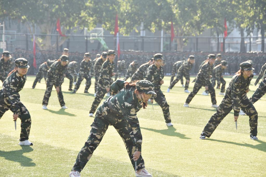 戎装上阵,英姿飒爽。军训技能和分列式汇报表演正式开始。战术方队手持钢枪、脸着油彩,跨越、奔跑、匍匐前进,突击、提肘、侧击、防护,每一个动作都干脆利落、行云流水;军体拳方队、匕首操方队轮番上阵,一招一式下是辛勤训练的结果,每一声嘹亮而激情的口号,都体现着青年的血气方刚,展示出科工大的威威军风。