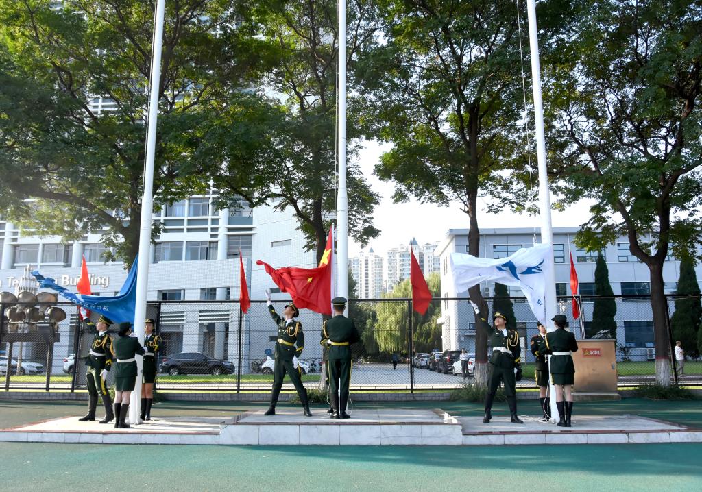 伴随着雄壮的国歌声,鲜艳的五星红旗在两面校旗的护卫下冉冉升起,所有师生垂手肃立,齐唱国歌,拉开了开学典礼的序幕。
