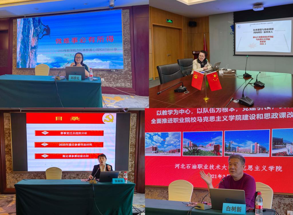接下来的调研中,我院在石家庄财经职业学院牵头组织了三场沙龙讲座。我院刘彦红老师作《做难事必有所得——2020年教学能力比赛参赛心得和经验分享》讲座,邀请张丽丽副教授(河北女子职业技术学院)、白树新教授(承德石油高等专科学校)分别交流《2020年职业院校教学能力比赛解析及参赛经验分享》和《全面推进职业院校马克思主义学院建设和思政课改革创新》。