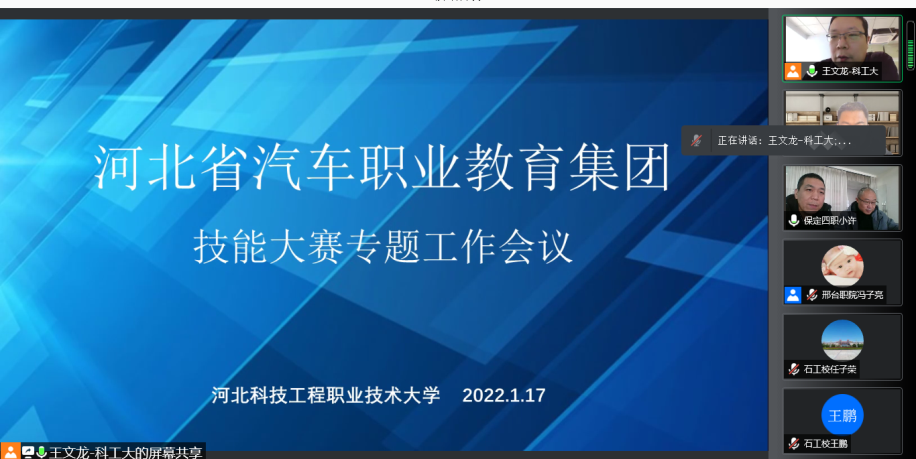 1月17日,河北省汽车职教集团召开2022年第一次技能大赛专题工作会议。受疫情影响,本次会议采用线上会议的形式进行。出席本次会议的有河北省技能大赛组委会办公室主任谢振宇、各赛项承办校主管校领导、best365汽车系部负责人及大赛主要筹备人员。大会由职教集团秘书处、best365汽车系副主任王文龙主持。