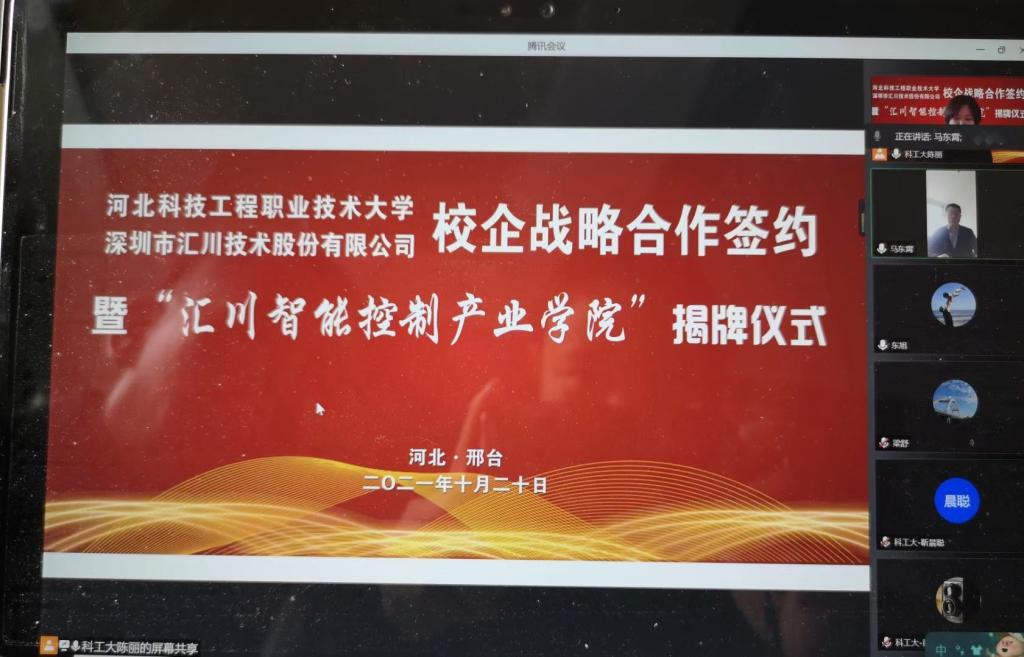 为贯彻落实《关于推动现代职业教育高质量发展的意见》和《现代产业学院建设指南(试行)》文件要求,10月20日上午,best365与深圳市汇川技术股份有限公司举行线上校企战略合作签约暨“汇川智能控制产业学院”揭牌仪式。校长马东霄、副校长李贤彬、汇川控制技术总工程师周保廷以及双方相关部门领导以视频连线方式出席,电气工程系全体教师线上参加,系主任陈丽主持。