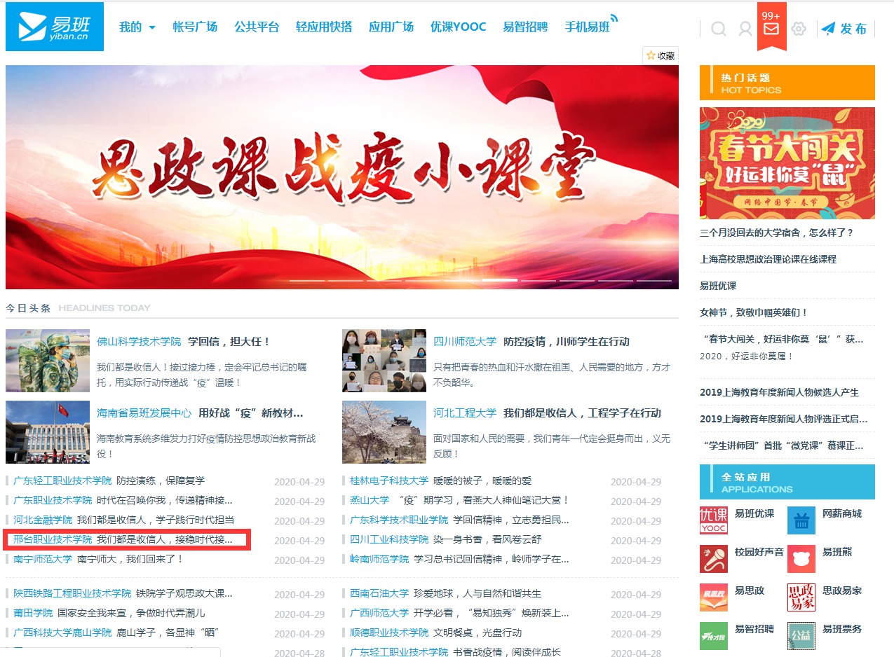 我院易班推文“@大接龙进行中|我们都是收信人,接稳时代接力棒”登上教育部全国易班网今日头条!自新冠肺炎疫情发生以来,邢职人不畏艰难,奋勇向前,展现了当代青年蓬勃的力量和勇于承担的责任心,也让他们的青春在这场战“疫”中熠熠生辉。