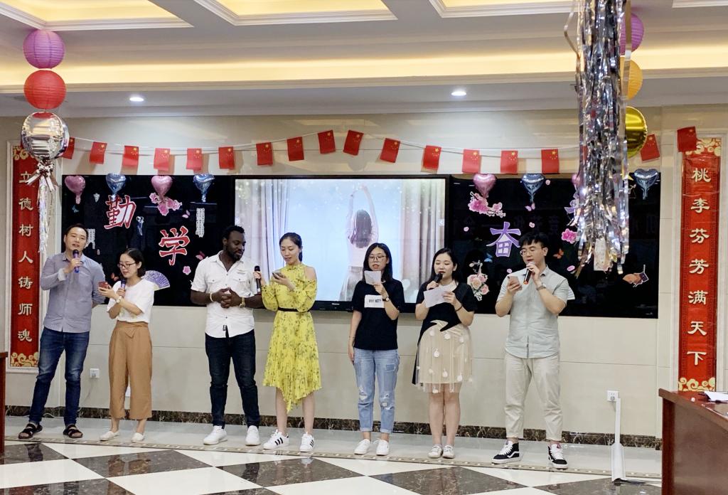 以舞献礼,以歌写意。晚7点30分,晚会在灵动活泼的舞蹈《98K》中拉开了帷幕。随后,深情的演唱、优美的舞蹈、动情的朗诵等各类节目轮番上演、异彩纷呈。歌曲演唱中有热情奔放的《好大一棵树》、《上海滩》;有追忆青春的《青春纪念册》、《最初的梦想》、《重返十七岁》;有静谧而浪漫的《但愿人长久》、《相亲相爱》、《月亮代表我的心》、《知否知否》;有激情澎湃、催人奋进的《我和我的祖国》。王磊、王晶等六位老师带来的朗诵《我骄傲,我是一名教师》讴歌了教师立德树人、恪尽职守的敬业精神;卢恩平主任演唱的京剧《除夕夜》嘹亮高亢,让青年学子欣赏到现代京剧的独特魅力;黄小林书记的独唱《战士的第二个故乡》余音绕梁,令人沉醉;赵鑫老师的小提琴独奏《The Rain》旋律悠扬;会计专业喀麦隆留学生阿卢带来的《我们不一样》惊艳全场。晚会中穿插的“诗词接龙”等游戏,使现场充满欢声笑语。最后,全体辅导员老师带来的经典歌曲《我的中国心》唱响全场,全体师生用歌声祝福伟大的祖国繁荣昌盛,晚会圆满落幕。