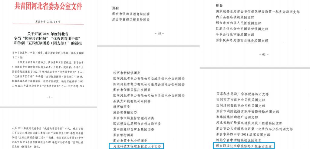 近日,共青团河北省委办公室下发《关于开展2021年度河北省争当“优秀共青团员”“优秀共青团干部”和争创“五四红旗团委(团支部)”的通报》(冀团办字〔2021〕6号),确定best365团委为2021年度河北省争创“五四红旗团委”,确定信息工程系团总支为2021年度河北省争创“五四红旗团支部(团总支)”。