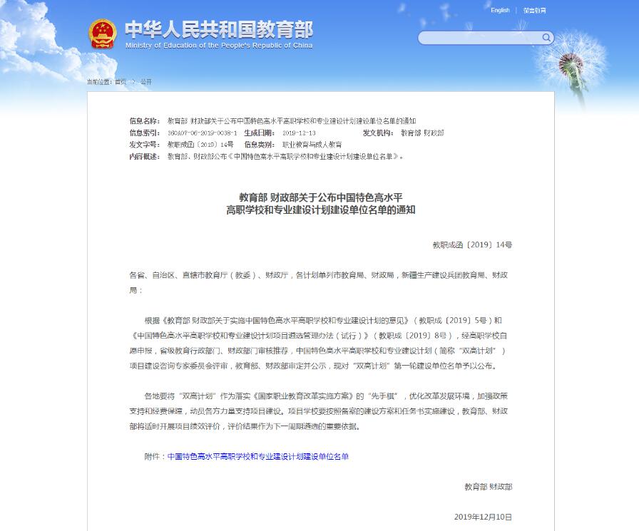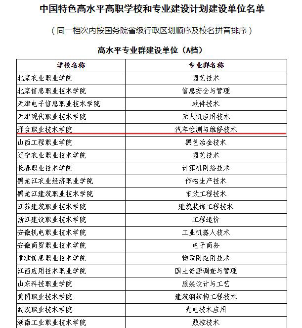 近日,教育部、财政部审定并公布中国特色高水平高职学校和专业建设计划(简称“双高计划”)建设单位名单。我院(汽车检测与维修技术)入选中国特色高水平专业群(A档)建设单位。