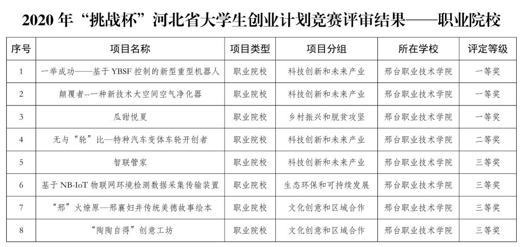 9月14日,2020年第十二届“挑战杯”河北省大学生创业计划竞赛落下帷幕。本届大赛自今年7月份启动以来,经过层层选拔,激烈角逐,学院报送的10项作品从全省88所学校的1423件参赛作品中脱颖而出,共有8项作品获奖,其中一等奖3项,二等奖1项,三等奖4项。