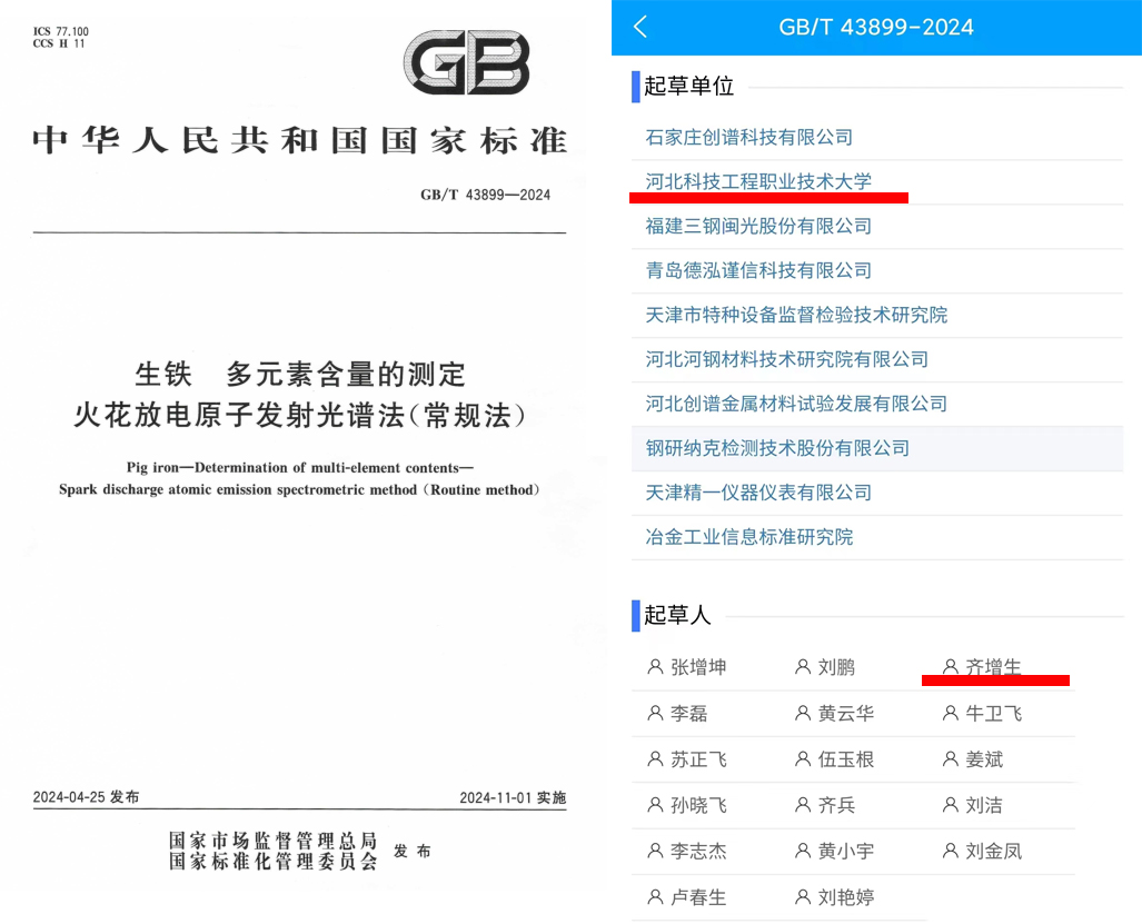 经国家市场监督管理总局、国家标准化管理委员会批准,国家标准GB/T43899-2024《生铁 多元素含量的测定 火花放电原子发射光谱法(常规法)》,于2024年4月25日发布,于2024年11月1日实施,经中华人民共和国标准2024年第6号公告正式公布。best365齐增生等老师参与了该国家标准的制定,是best365参与起草国家标准的有益尝试。在标准立项和制定过程中,科技处、机电工程系给予大力支持。