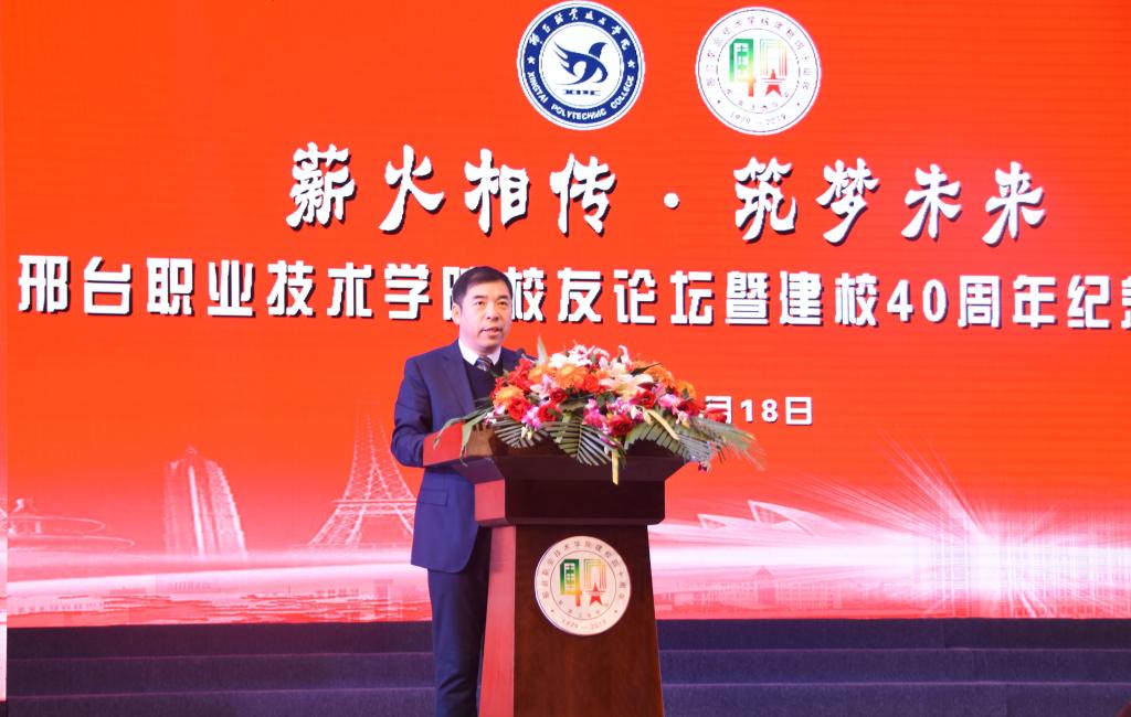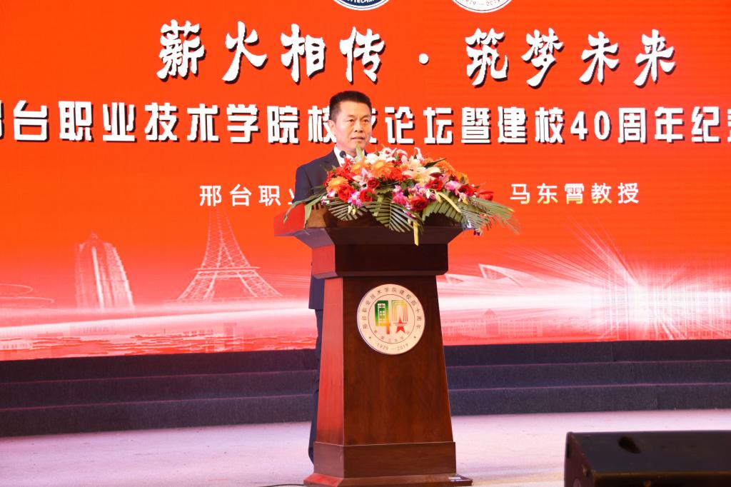 纪念大会在雄壮的国歌声中拉开帷幕。马东霄院长发表致辞,他代表学院全体师生员工向来自全国各地的校友表示热烈欢迎。马院长回顾了学院办学四十年的光辉历程,一代代邢职人坚守初心、勇担使命,传承“雷厉风行、团结奉献、实干创新、追求卓越”的学院精神,不断开拓创新、艰苦奋斗,创造了“七个全国第一”的辉煌成就。面对未来,我们充满信心。他希望,广大校友和在校师生要永远铭记军需人、邢职人的拼搏精神,紧跟新时代、开启新征程、担当新使命,为实现学院新的跨越式发展不懈奋斗。