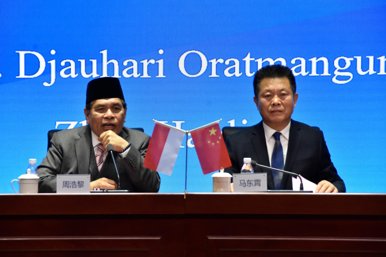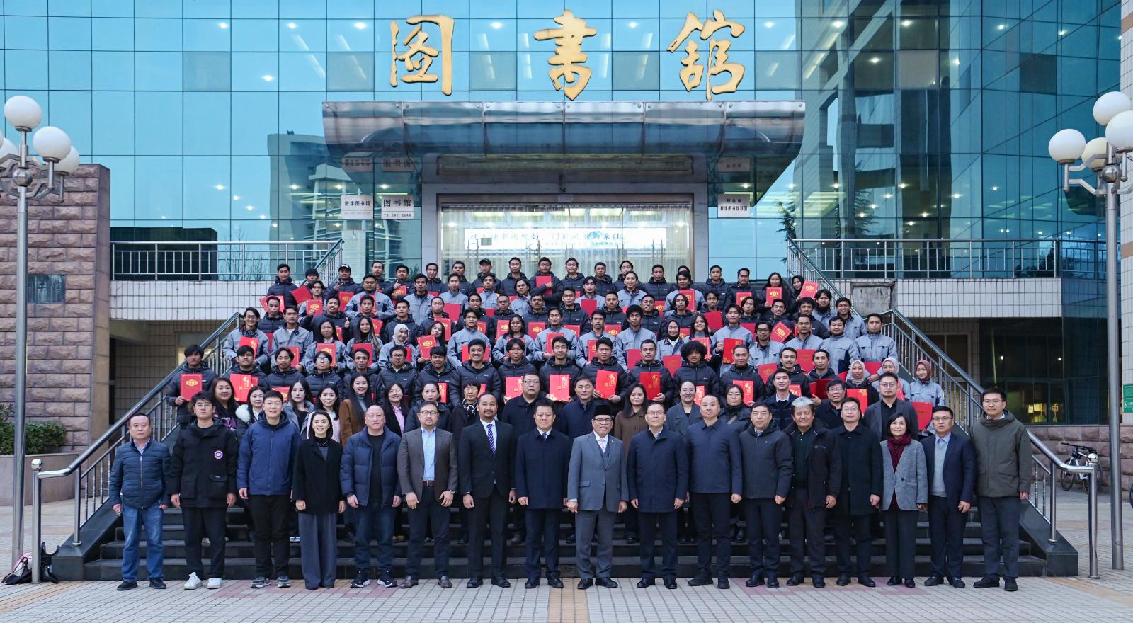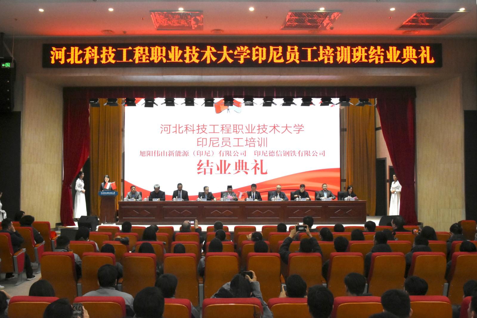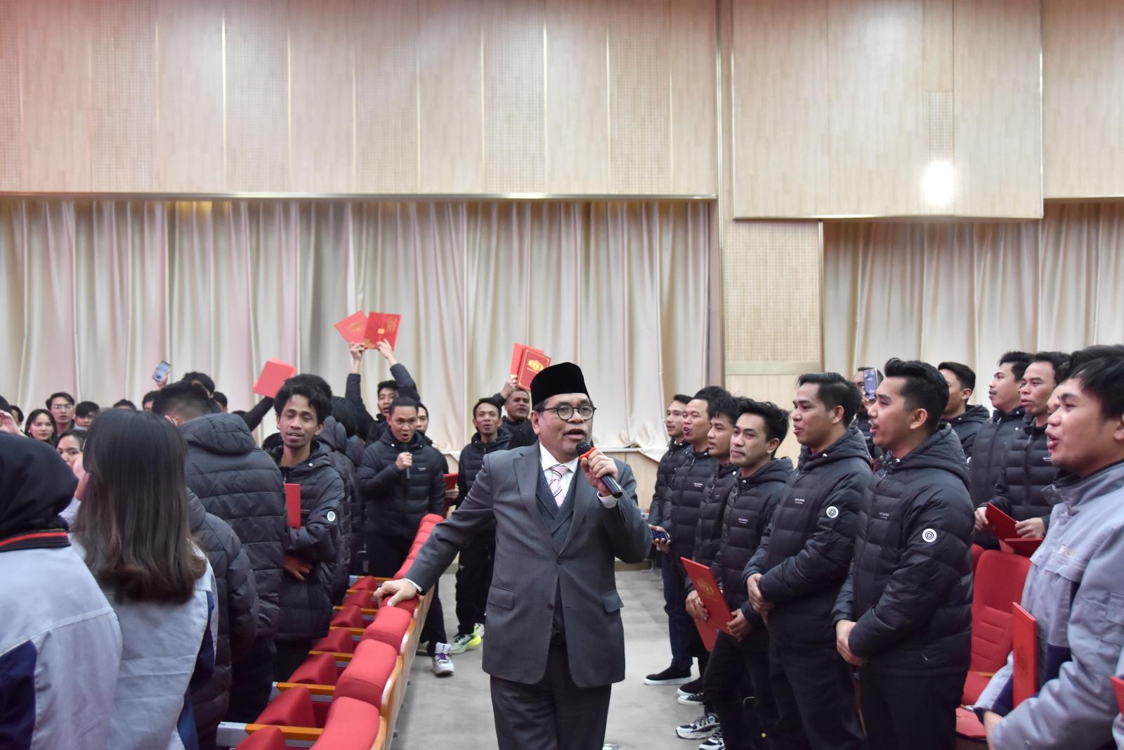 1月4日下午,best365在创意中心报告厅隆重举行旭阳集团、德信钢铁有限公司印尼员工培训结业典礼。印度尼西亚驻华大使周浩黎先生(Drs.Djauhari Oratmangun)应邀出席。best365党委书记马东霄、副校长李贤彬、副校长刘卫红等校方领导,旭阳集团执行总裁李庆华,德龙钢铁集团执行总裁刘国旗等企业领导以及相关部门领导、老师、83位印尼学员共同参加本次典礼。典礼由国际交流中心主任马烁主持。