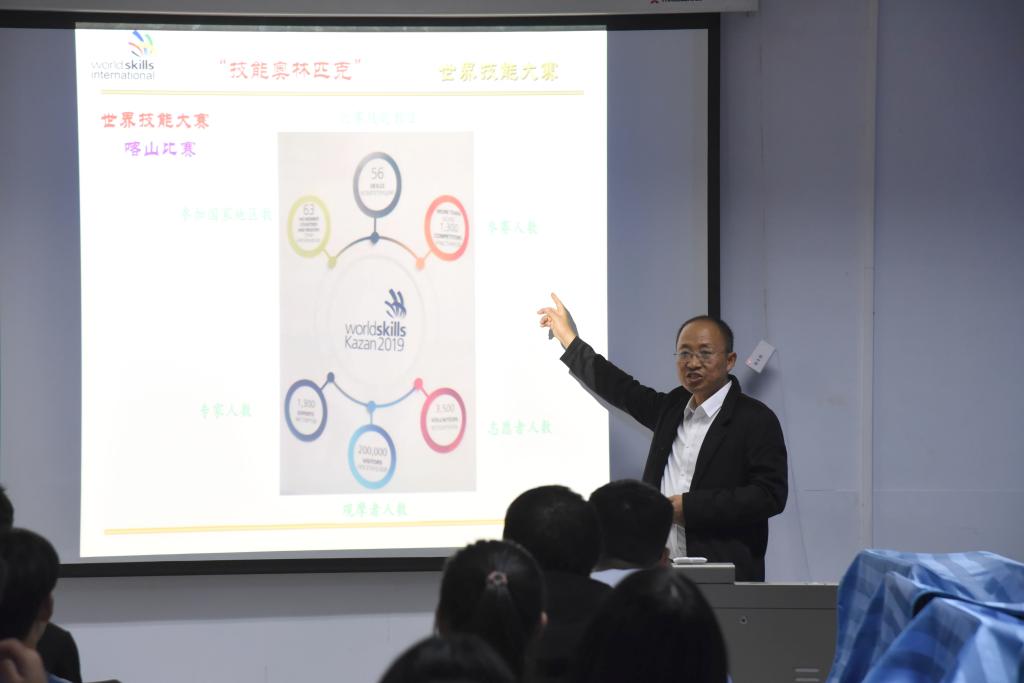 参观结束后,王湛教授开展了经验交流讲座。他详细介绍了开展职业教育的必要性、世界技能大赛的发展历史、世界技能大赛在中国的发展以及我国历届世界技能大赛获奖选手的奖励等几方面内容;全面解读了世界技能大赛水处理项目的参赛指南,分析了该赛项的研究对象、项目的特殊性、工作任务、具体考核内容等;最后,王湛教授用习近平主席“奋斗是青春最亮丽的底色”鼓励学生努力奋斗,为国争光。