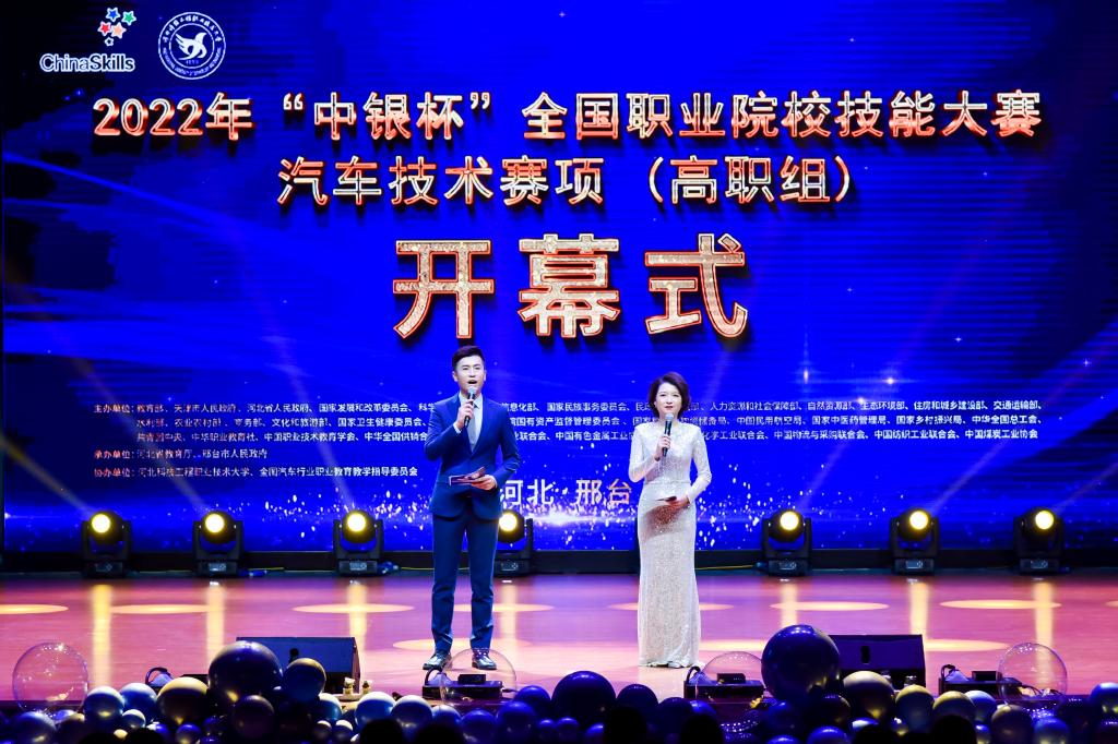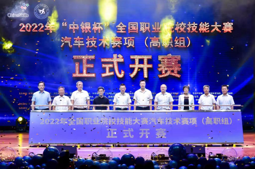 在热烈的掌声中,领导上台共同推杆启动汽车元素特效,2022年全国职业院校技能大赛高职组汽车技术赛项正式开赛!歌舞节目《奋斗吧中国》,预祝所有参赛选手取得优异成绩。