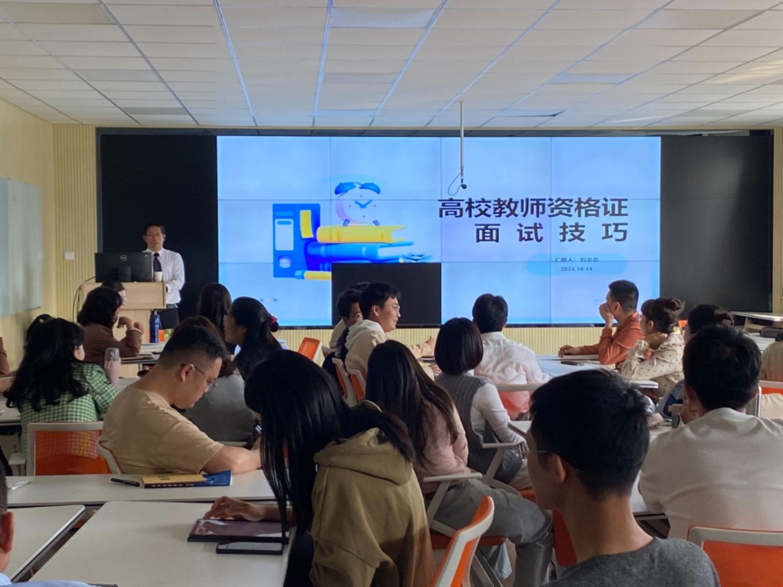 10月14日—10月24日教师资格证专项突破培训,建筑工程系书记刘志忠教授为新教师做“教师资格证面试技巧”专题讲座,电气工程系程德芳老师为新教师开展面试模拟与答辩辅导。