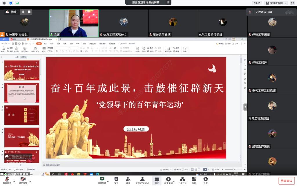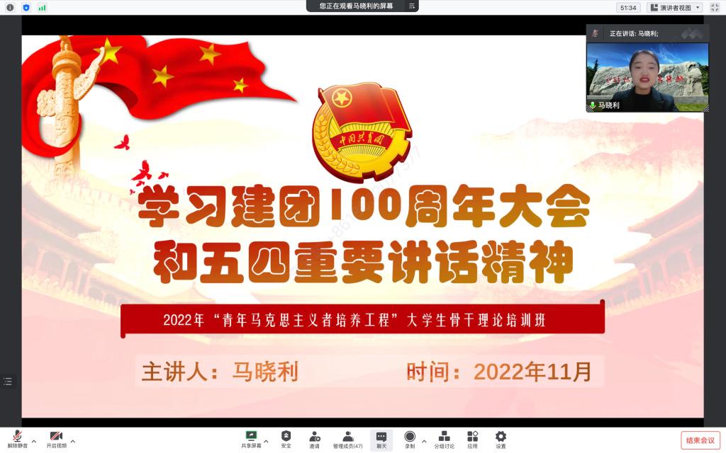 根据学校常态化疫情防控要求,培训班邀请了十系团总支书记线上授课,青年老师们通过专题讲座、分组讨论、线上互动等形式,重点围绕党的二十大精神、党的青年运动史、建团100周年大会精神、新时代的伟大变革、新时代的伟大成就、学生骨干能力提升等专题开展精彩分享,教育引导广大团员青年进一步筑牢信仰根基,提升本领能力,勇担时代重任,不负青春韶华,不断增强学生骨干的理论水平和政治素养,切实做到学深悟透、融会贯通。11月13日晚,校团委举办结业考试,全体学员参加了本次考试并顺利结业。