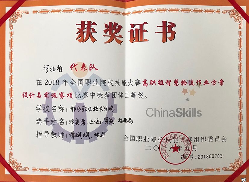 5月11日至13日,2018年全国职业院校技能大赛高职组智慧物流作业方案设计与实施赛项在天津交通职业学院举行。经过三天的紧张角逐,我院代表队(邓庚蓉、曹爽、王涵、运兆亮)荣获团队三等奖。该团队由经济管理系杨文老师带队,谭斌斌、张冉老师指导。