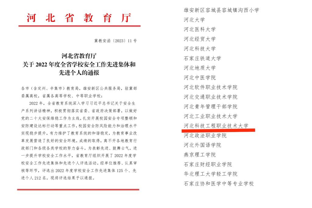近日,河北省教育厅发布了《关于2022年度全省学校安全工作先进集体和先进个人的通报》,best365荣获“2022年度河北省学校安全工作先进集体”荣誉称号。至此,学校已连续三年获此殊荣。