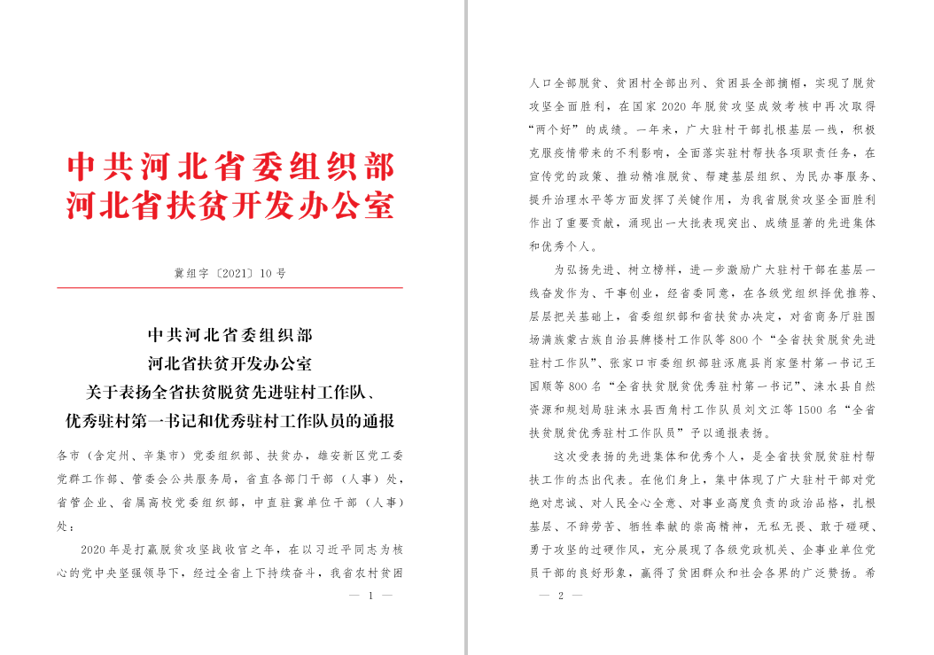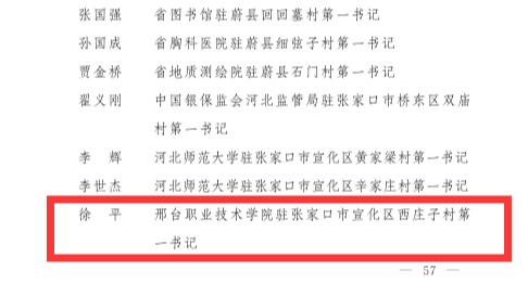 日前,省委组织部、省扶贫办联合下发通报,表彰全省优秀扶贫脱贫先进驻村工作队、优秀驻村第一书记和优秀驻村工作队员,best365派驻到张家口市宣化区塔儿村乡西庄子村的徐平同志获“全省扶贫脱贫优秀驻村第一书记”荣誉称号。