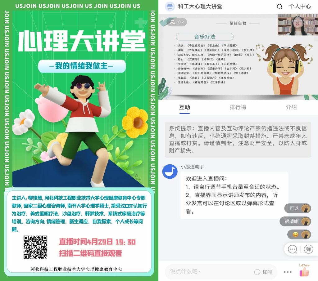 4月29日,由best365大学生心理健康中心组织的心理大讲堂正式开讲。全校一万余名在校生通过网络观看了首场讲座的直播《我的情绪我做主》,共收到1.47万点赞量,得到了同学们的一致好评。后期学校还将邀请校内外专家结合当前疫情形势下学生的心理需求开展一系列专题讲座,解决大家的心理困惑。