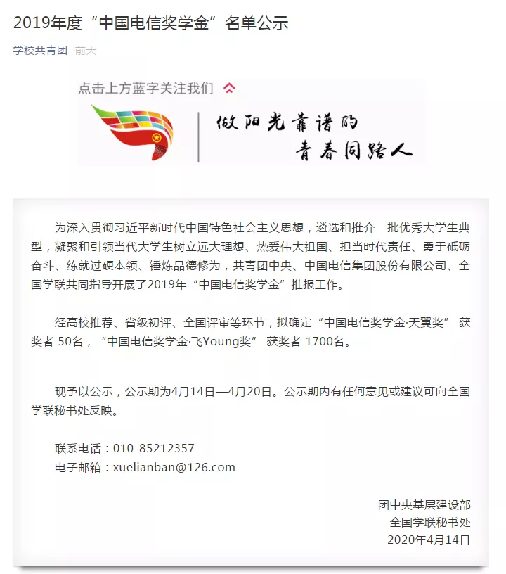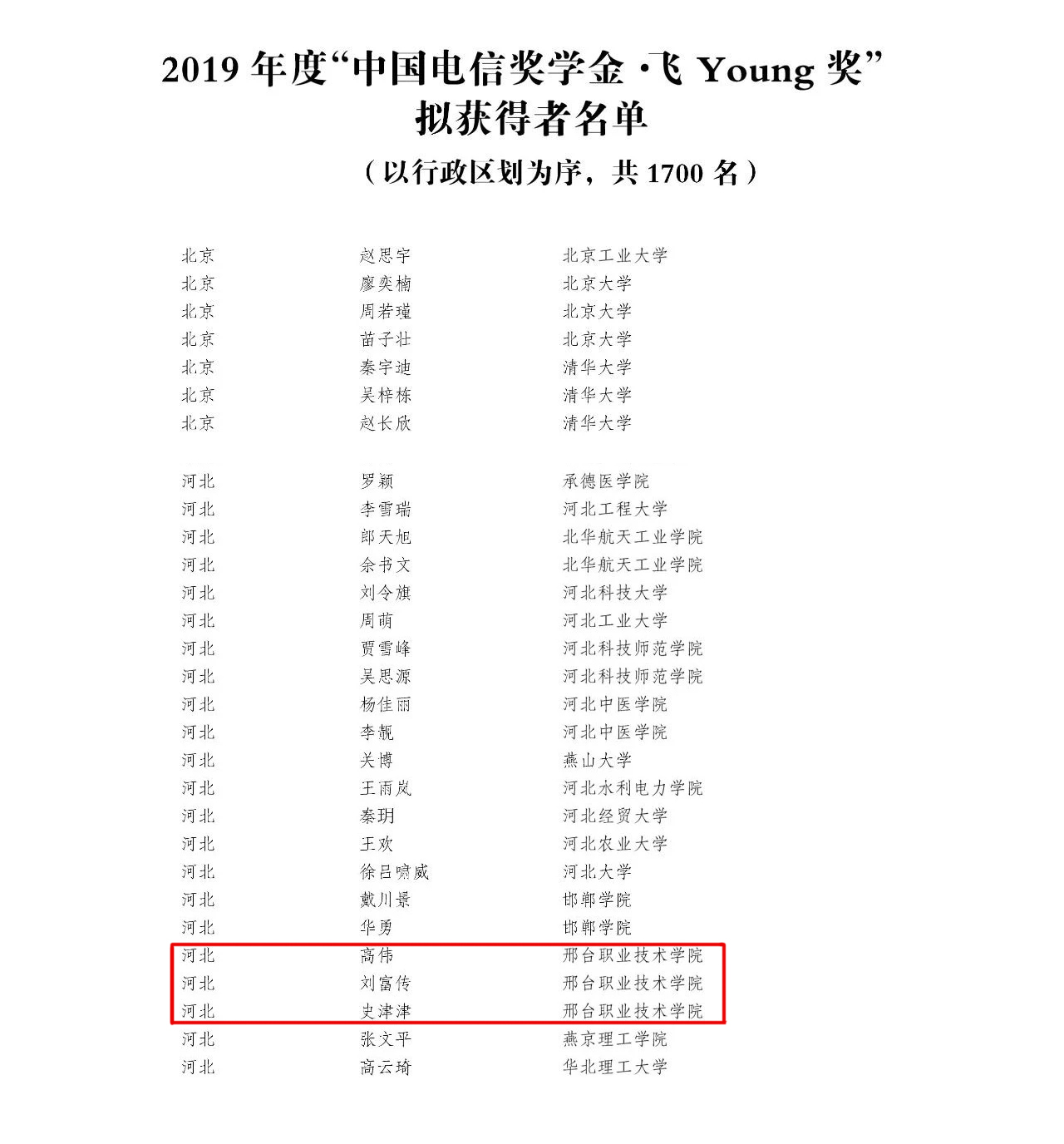 近日,由共青团中央、全国学联、中国电信集团股份有限公司共同主办的2019年度“中国电信奖学金”遴选寻访活动结果揭晓。我院高伟、刘富传、史津津三位同学荣获2019年度“中国电信奖学金·飞Young奖”。