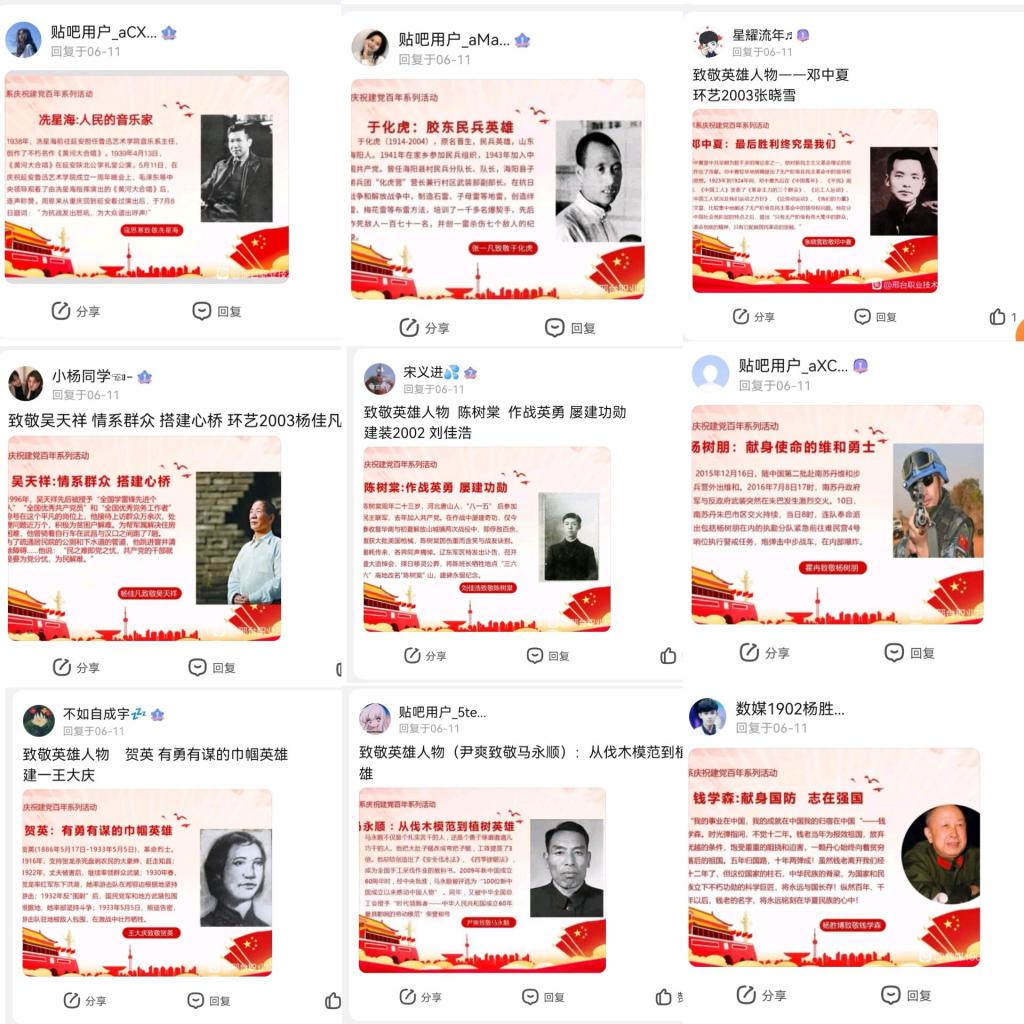 “建党百年瞬间”之“这个人”,每名学生党员和入党积极分子以英雄人物作为自己的榜样,有黄继光、董存瑞、刘胡兰等为新中国成立壮烈牺牲的革命先烈,有屠呦呦、茅以升、申纪兰等为新中国建设呕心沥血的时代英模,他们以自己铮铮的精神风骨、坚定的理想信念、赤诚的家国情怀为大家坚定了信仰,指明了努力方向。