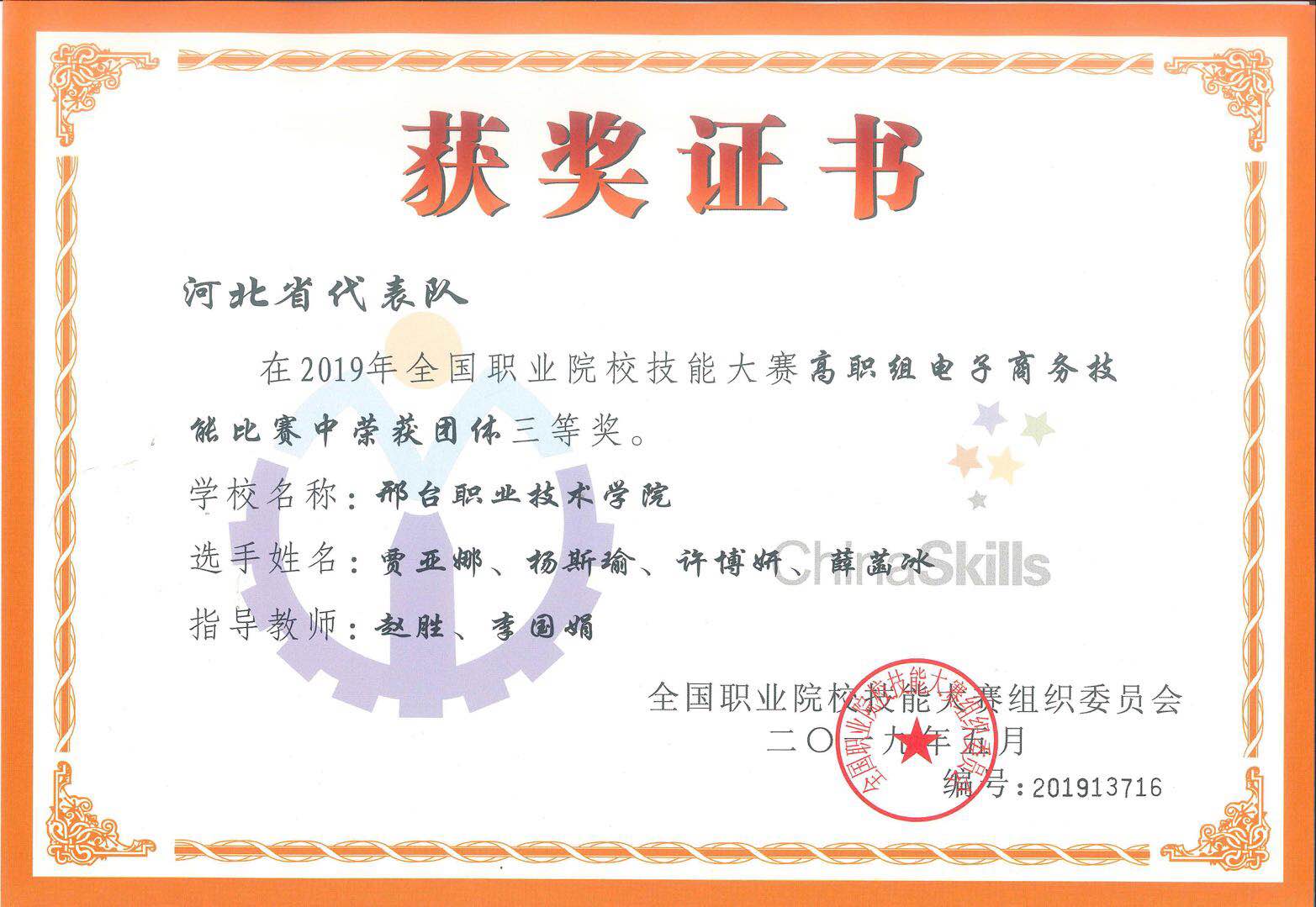 2019年全国职业院校技能大赛高职组“电子商务技能”赛项决赛于5月18日在济南工程职业技术学院落下帷幕,大赛云集了各省、直辖市、自治区的87支代表队348名选手。我院信息工程系褚建立主任领队,赵胜和李国娟老师指导的贾亚娜、杨斯瑜、许博妍、薛菡冰4名同学组成的代表队在本次大赛中荣获团队三等奖。