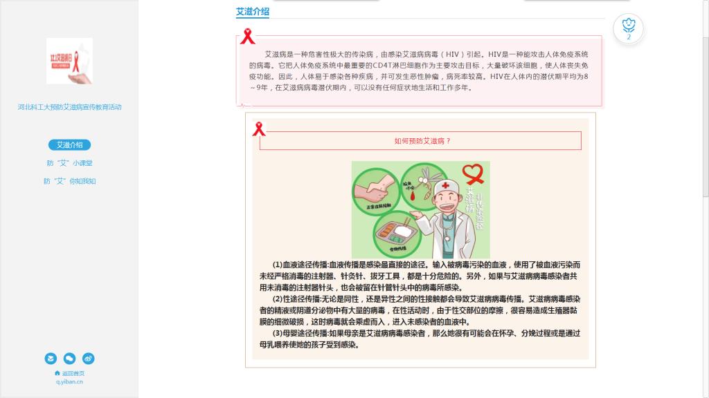 宣传活动以青春健康同伴社、学校志愿者协会、易班为主体,先后开展了艾滋病防控知识线上有奖竞答、防艾抗艾倡议签名、新媒体专项宣传、宣传彩页发放等活动。通过线上与线下相结合的方式实现了宣传全覆盖,通过学生喜闻乐见的宣传形式进一步提高了学生对艾滋病的防范意识、以及对相关知识的知晓率。