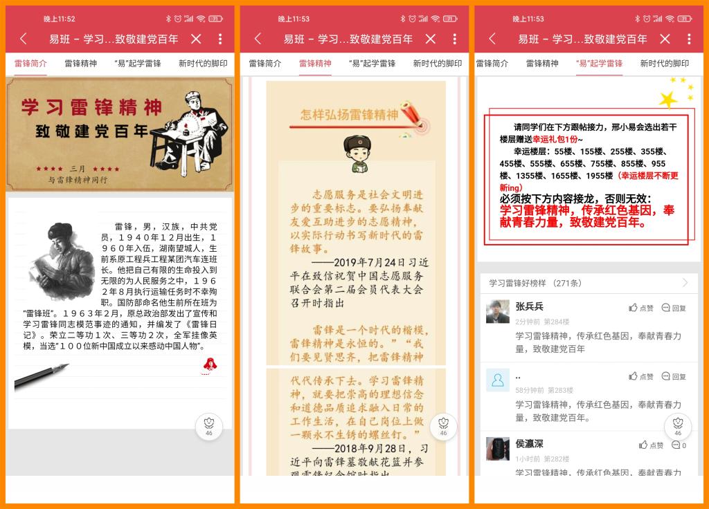 3月4日,学生工作处(团委)依托易班平台上线“学习雷锋精神致敬建党百年”轻应用,通过图文形式解读新时代雷锋精神,同时发起了“学习雷锋精神,传承红色基因,奉献青春力量,致敬建党百年”接力盖楼活动,同学们用实际行动诠释雷锋精神,彰显青春风采,让新时代雷锋精神内化于心,外化于行。