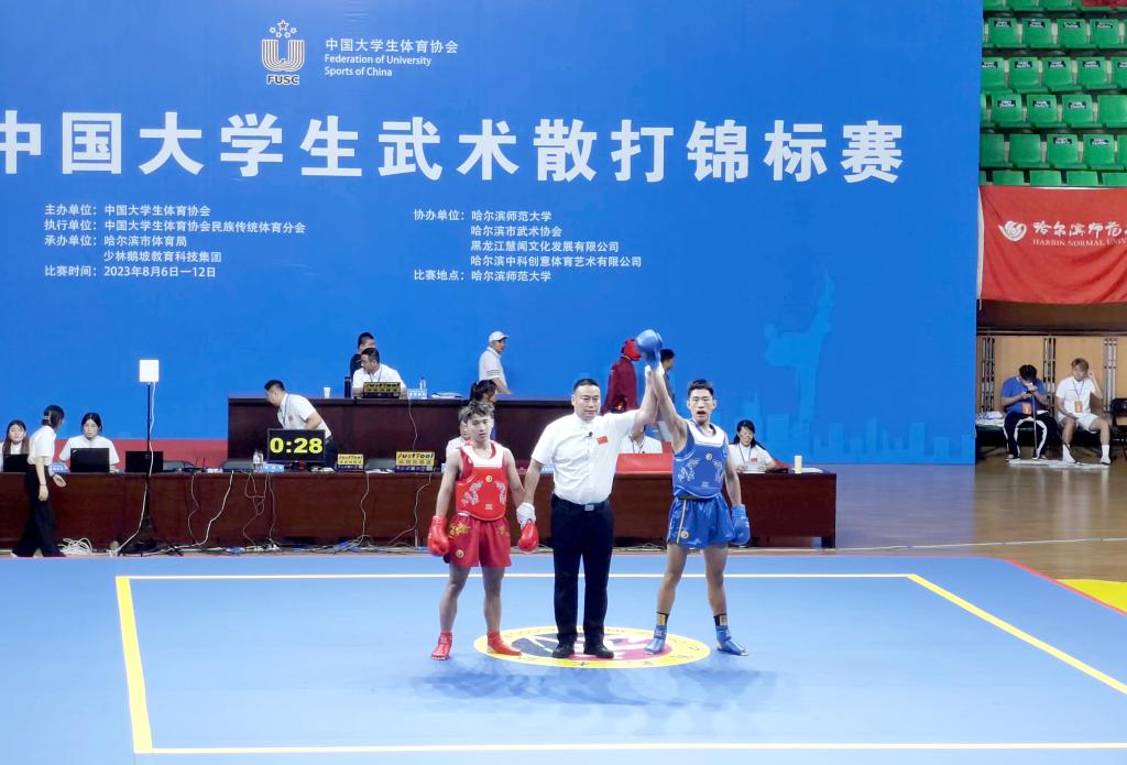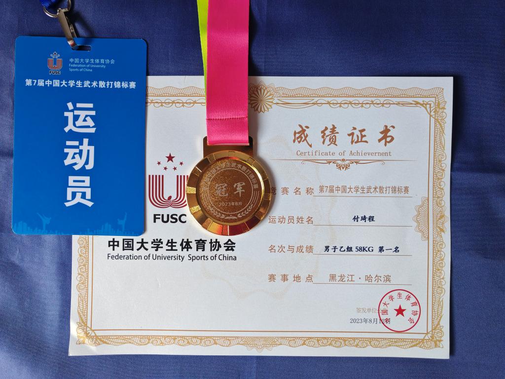 8月6日至12日,第七届中国大学生武术散打锦标赛在哈尔滨师范大学体育馆举行。best365散打队教练张天洋带领会计系财富管理2201班学生付琦程参加男子乙组58公斤级的比赛,经过几天紧张激烈的争夺,最终付琦程在冠亚军争夺战中击败对手斩获冠军,同时获优秀运动员奖,张天洋获优秀教练员体育道德风尚奖。