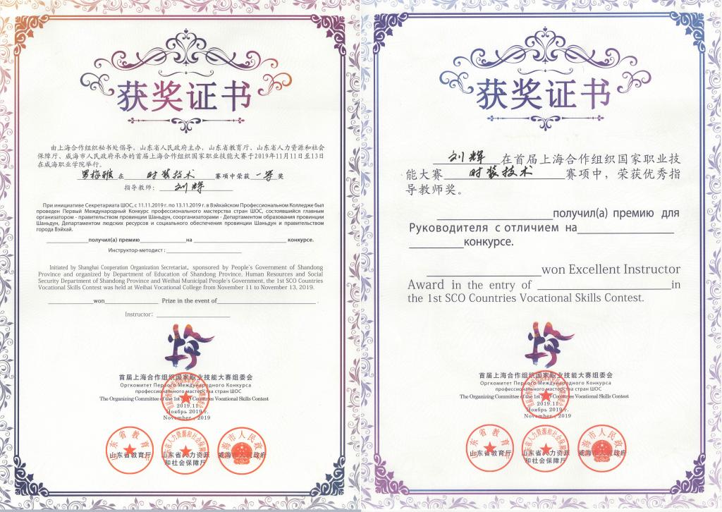 11月11日至13日,在山东威海职业学院举办了上海合作组织国家职业技能大赛。本次大赛由上海合作组织秘书处倡议,山东省人民政府主办,威海市人民政府、山东省教育厅、山东省人力资源和社会保障厅承办。我院服装工程系选手罗梅雅同学荣获一等奖,刘辉老师获得优秀指导教师奖。