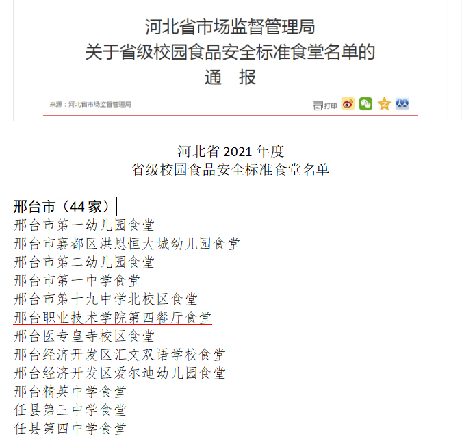 此次评选是省市场监督管理局为全面提升学校食堂食品安全水平,充分发挥省级标准食堂的示范引领作用,按照《河北省校园食品质量安全水平提升三年行动计划(2019-2021年)》工作目标和任务要求,采用典型引领、动态管理、市级评定的原则,对全省校园食堂进行的食品安全评定,共评选出省级校园食品安全标准食堂455家,其中邢台44家。