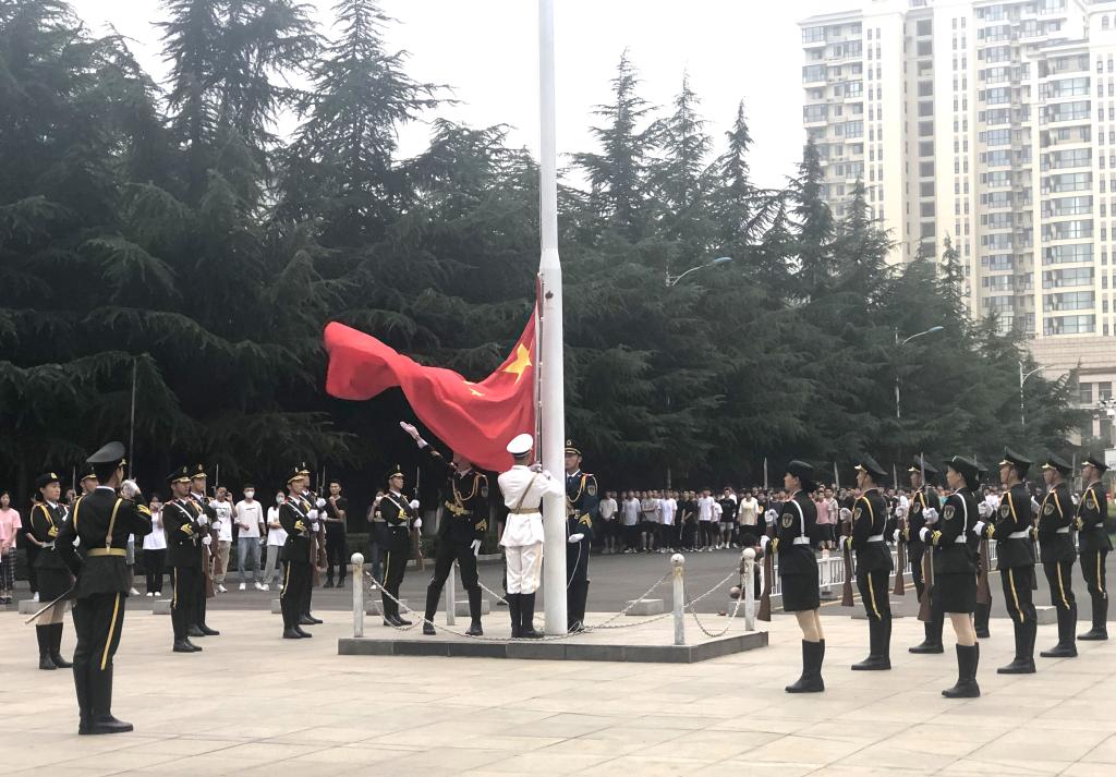 6时30分,校国旗护卫队以挺拔的身姿,整齐的步伐,坚毅的眼神,护送国旗来到升旗台。伴随着雄壮的国歌,鲜艳的五星红旗冉冉升起。参加升旗仪式的师生齐声奏唱国歌,行注目礼。升旗仪式结束后,电气工程系学生身着象征青春朝气的天空蓝上衣,围坐在台阶上,摆出“爱心”造型,紧紧围绕着由四位教官手执的鲜艳党旗,突出“我心向党”的主题。