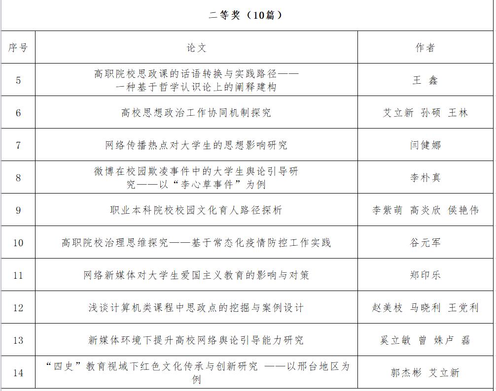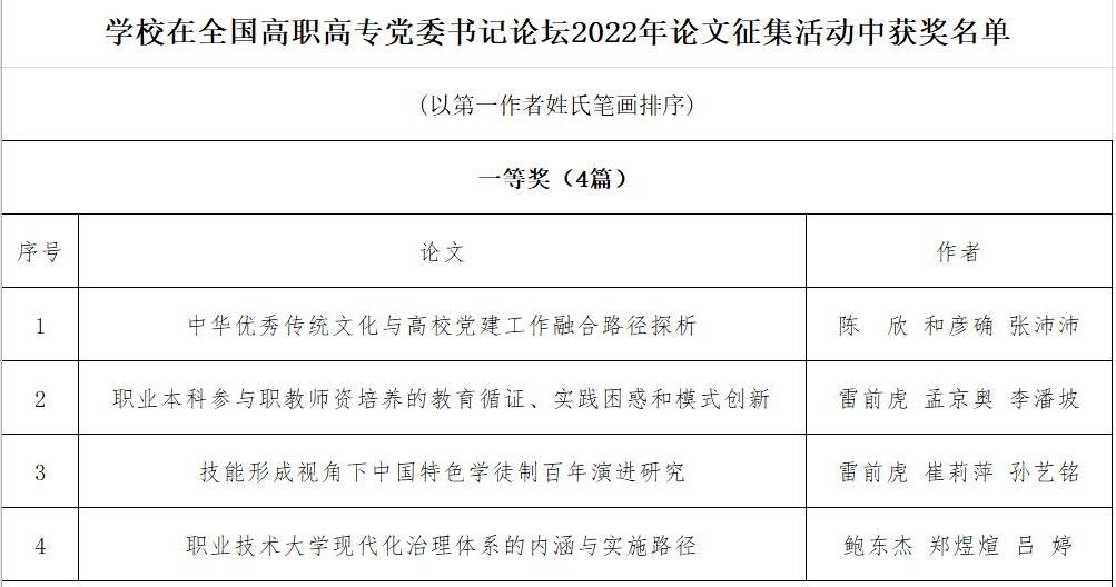 2022年全国高职高专党委书记论坛论文征集活动于今年5月至7月举行,论文征集范围包括发展战略、党的建设、思想政治教育和校园文化等,经查重审核后学校共推荐论文33篇,获一等奖4篇、二等奖10篇、三等奖10篇。