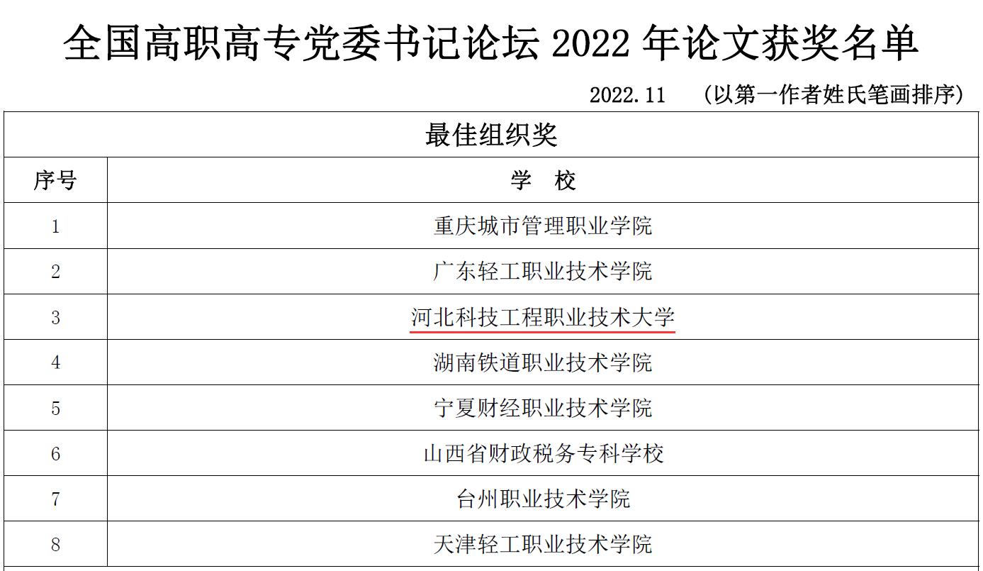 近日,全国高职高专党委书记论坛学术委员会公布2022年论文评审结果,best36524篇论文获奖,论文质量和获奖数量均居全国高职院校前列,学校同时获评2022年论文征集活动最佳组织奖,这是best365连续第四年获此奖项。