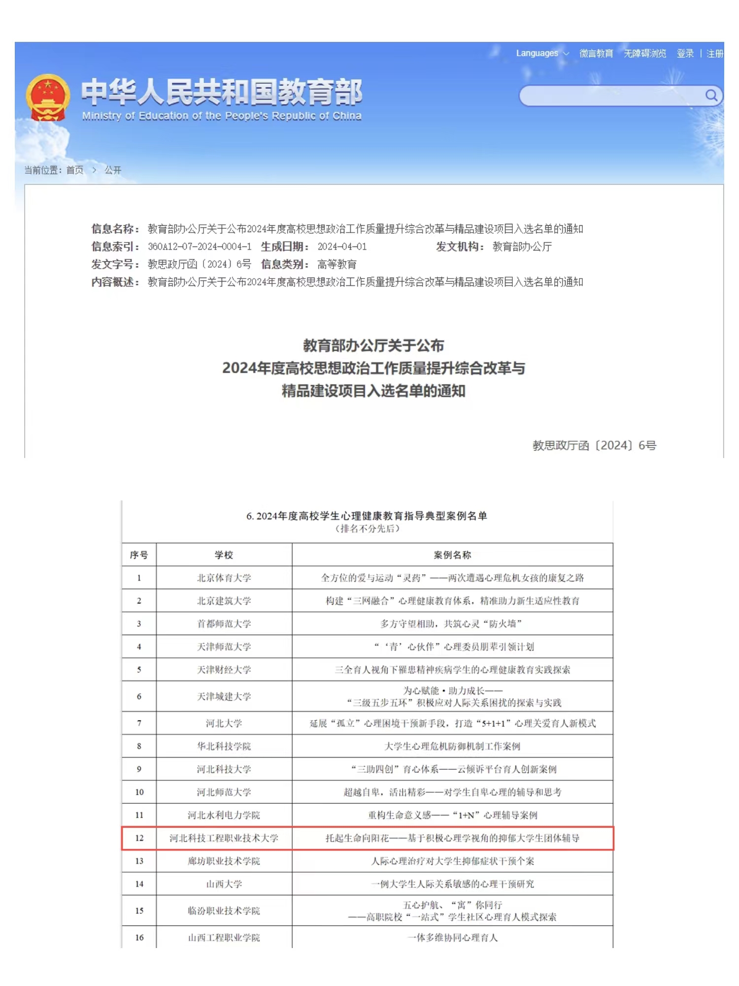 近日,教育部公布了2024年度高校思想政治工作质量提升综合改革与精品建设项目公示名单,best365主持申报的《托起生命向阳花——基于积极心理学视角的抑郁大学生团体辅导》喜获“2024年度高校学生心理健康教育指导典型案例”。