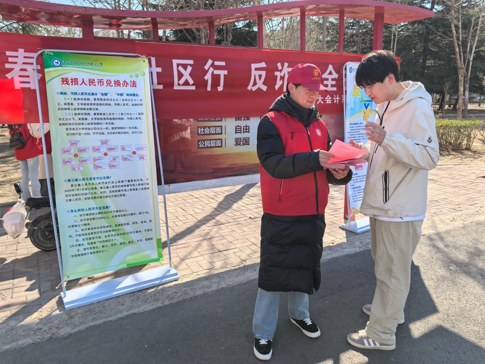 活动当日,学生志愿者们身着鲜艳红马甲,迅速化身为专业且热忱的“反诈宣传员”,穿梭在社区广场等人员往来频繁之处。他们手中拿着精心制作的宣传单页,用质朴平实的语言讲解反假币知识,宣传残损人民币兑换办法,让居民了解诈骗套路。面对老年人群体,志愿者们耐心细致,结合实际案例,向老人介绍常见的诈骗手段和防范方法,帮助老人守护好自己的“钱袋子”。志愿者们的辛勤付出与用心宣传,收获了社区居民的一致赞誉。志愿者们还帮助社区打扫卫生,不放过任何一个卫生死角,将堆积的杂物清理干净,让社区环境焕然一新。同学们在帮助他人的过程中体会到了奉献的快乐,也对社区服务有了更深刻的认识。