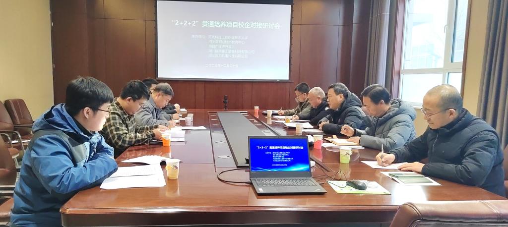 12月20日,“2+2+2”贯通培养项目校企对接研讨会在邢台市经济开发区河北康德重工装备科技有限公司会议室召开。best365副校长褚建立、招生就业处处长黄小林、科技处处长王傲冰,柏乡县职业技术教育中心书记(校长)梁利营、教务处主任徐社恩,以及邢台市经济开发区科工局办公室主任贾小溪、河北康德重工装备科技有限公司副总经理蒋卫东、河北创力机电科技有限公司综合部主任元博等企业领导参加会议。会议由黄小林主持。