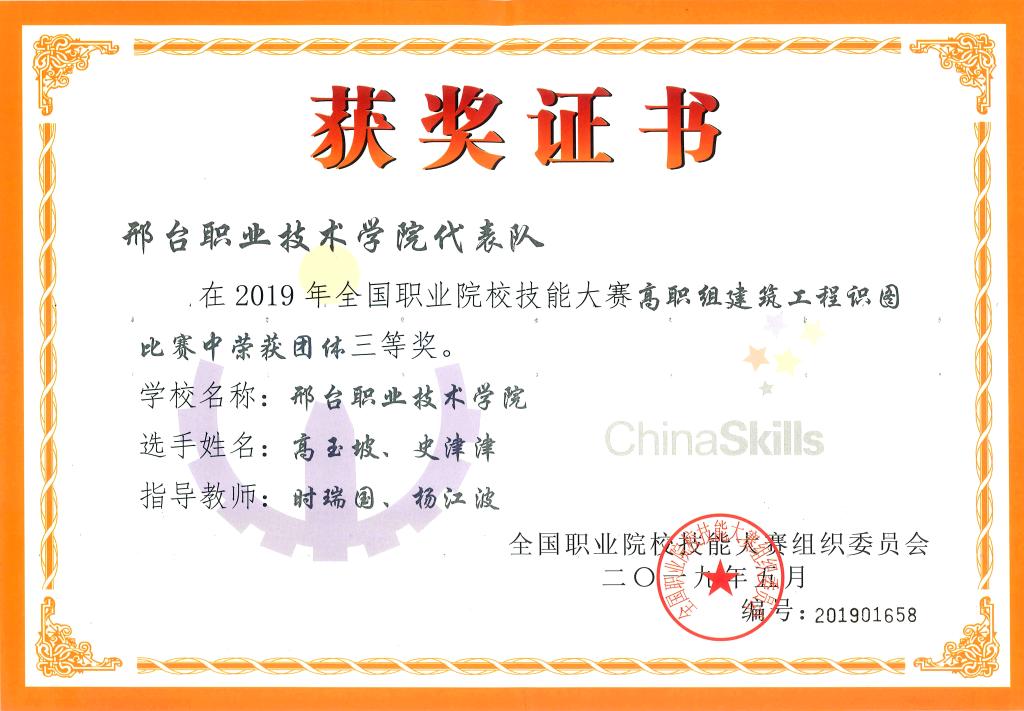 5月11日,2019年全国职业院校技能大赛高职组“建筑工程识图”赛项在天津城市建设职业技术学院圆满落幕。我院建筑工程系时瑞国和杨江波老师指导的高玉坡、史津津2名参赛同学在105支参赛队伍中以第33名的优异成绩荣获团体三等奖。