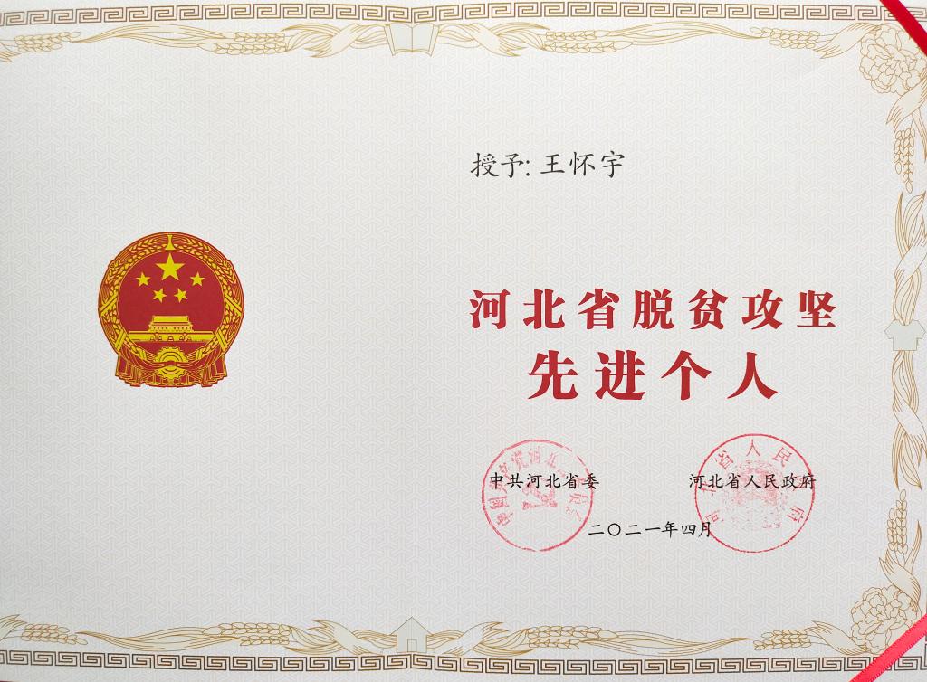 近日,中共河北省委、河北省人民政府通报表彰全省脱贫攻坚先进个人和先进集体。best365资源与环境工程系教师王怀宇被授予“河北省脱贫攻坚先进个人”称号。