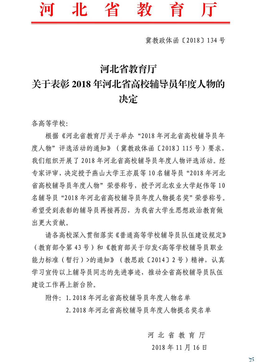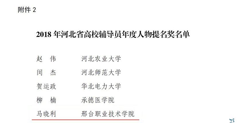 11月16日,河北省教育厅发布《关于表彰2018年河北省高校辅导员年度人物的决定》,我院信息工程系教师马晓利获得“河北省高校辅导员年度人物提名奖”荣誉称号。据悉,河北省内各高校仅10人获得此项荣誉,此次获奖是对我院辅导员工作的肯定,也将推动我院辅导员队伍建设再上新台阶。