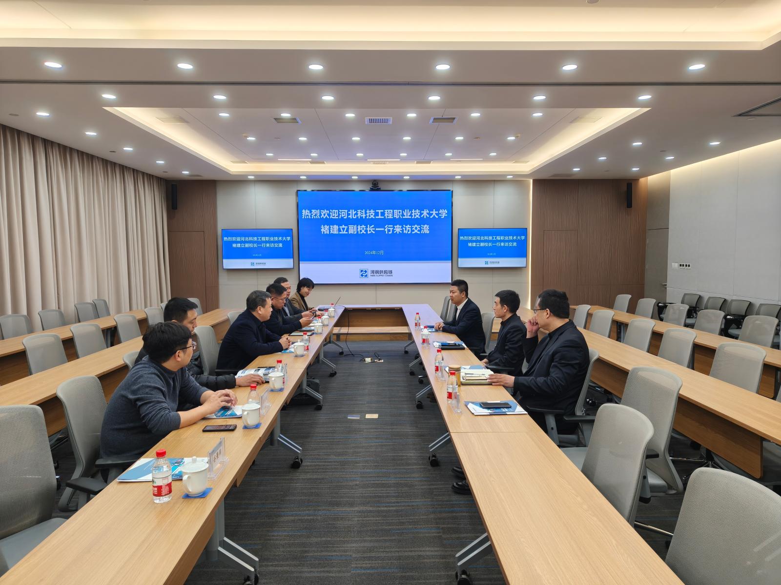 在河钢集团供应链管理有限公司,best365与河北创鉴科技集团有限公司董事长程军海一行受到了公司总经理李峰辉的热情接待。褚建立首先向公司介绍了学校的发展历程,随后,李峰辉、程军海分别介绍了各自公司的基本情况和业务范围,双方就实训平台、实践课程、教学场景搭建、教学资源和案例等方面进行了交流,达成了“以企业发展需求为导向,深化校企合作,支持以产教融合项目合作形式向学校开发转化成果”的合作愿景。