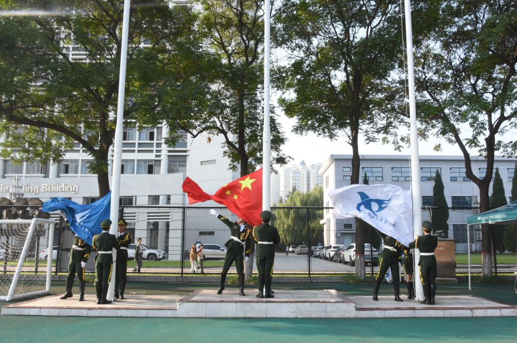 典礼在庄严的升旗仪式中拉开帷幕,全场5000余人齐唱国歌。