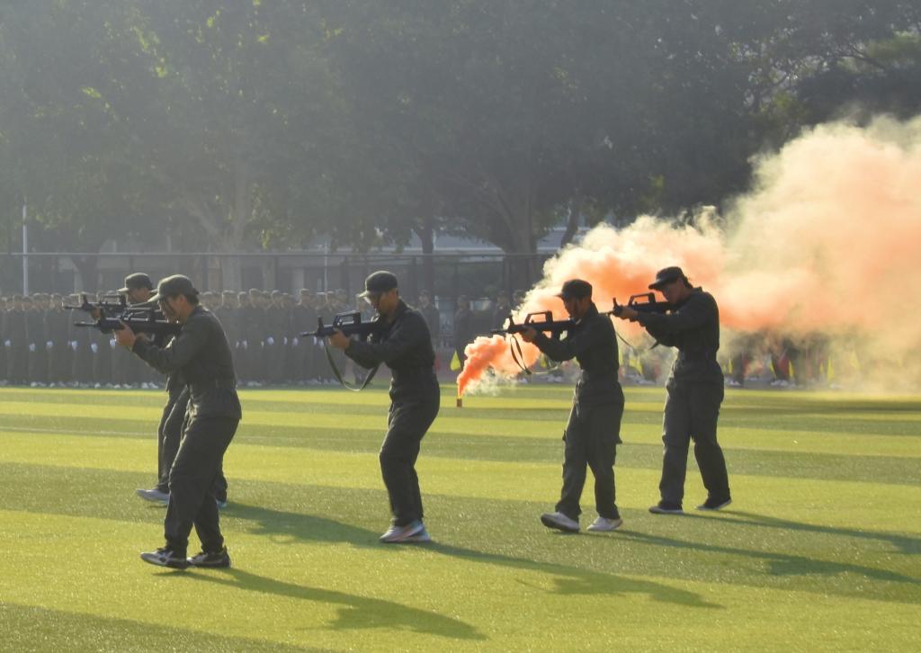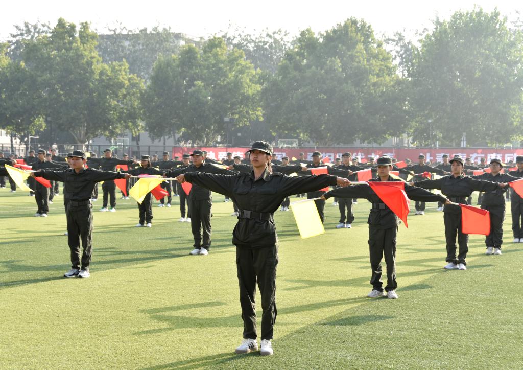 弥漫的硝烟中,逼真的综合战术演练正式开始,穿越火线、匍匐前进、擒拿格斗等科目展现了科工大学子英勇果敢的战斗素养,赢得了在场师生的阵阵掌声。步履铿锵旗飞扬,军体拳威震四方。马步、弓步,冲拳、勾拳……军体拳方队的同学们目光坚毅,一招一式,有模有样,气势恢宏。伴随着充满力量的军歌,红色与黄色小旗交相挥舞,在旗语操展示环节,学生们英姿飒爽,动作整齐划一,打出“无声语言”,震撼人心。“一、二、三、四!”分列式方阵的口号声声响彻云霄,各方队步伐铿锵、军容严整,尽显各系学子的飒爽风采。