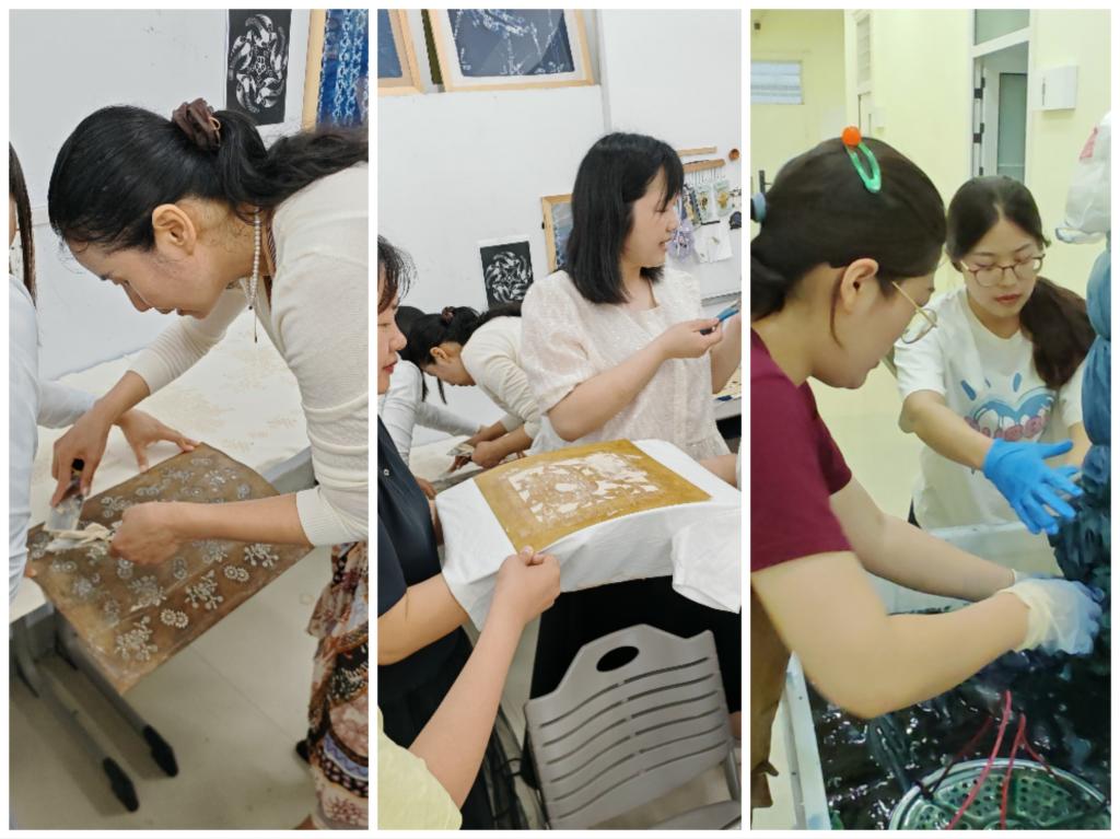 活动现场,大家先利用AI人工智能技术,探索生成具有印花特色的创意图形图像形成数字资源;再由胡颖博士为大家示范豆面印花独特的工艺流程。从原料配比到染色,师生纷纷动手尝试每个环节,将豆面精心制版,最终浸入染缸,见证色彩的奇迹转变。
