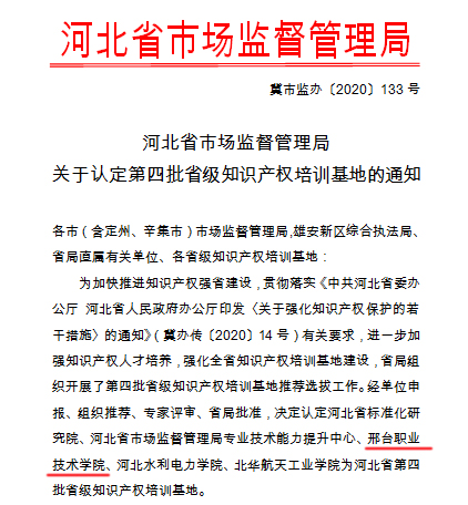 近日,经河北省市场监督管理局批准,我院获批设立河北省知识产权培训基地。截至目前,全省共建设4批15个单位。
