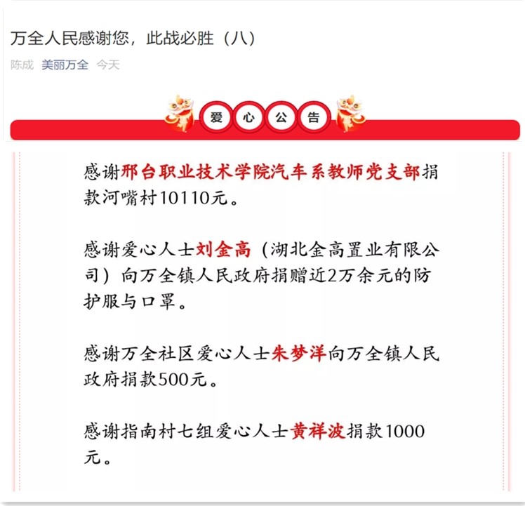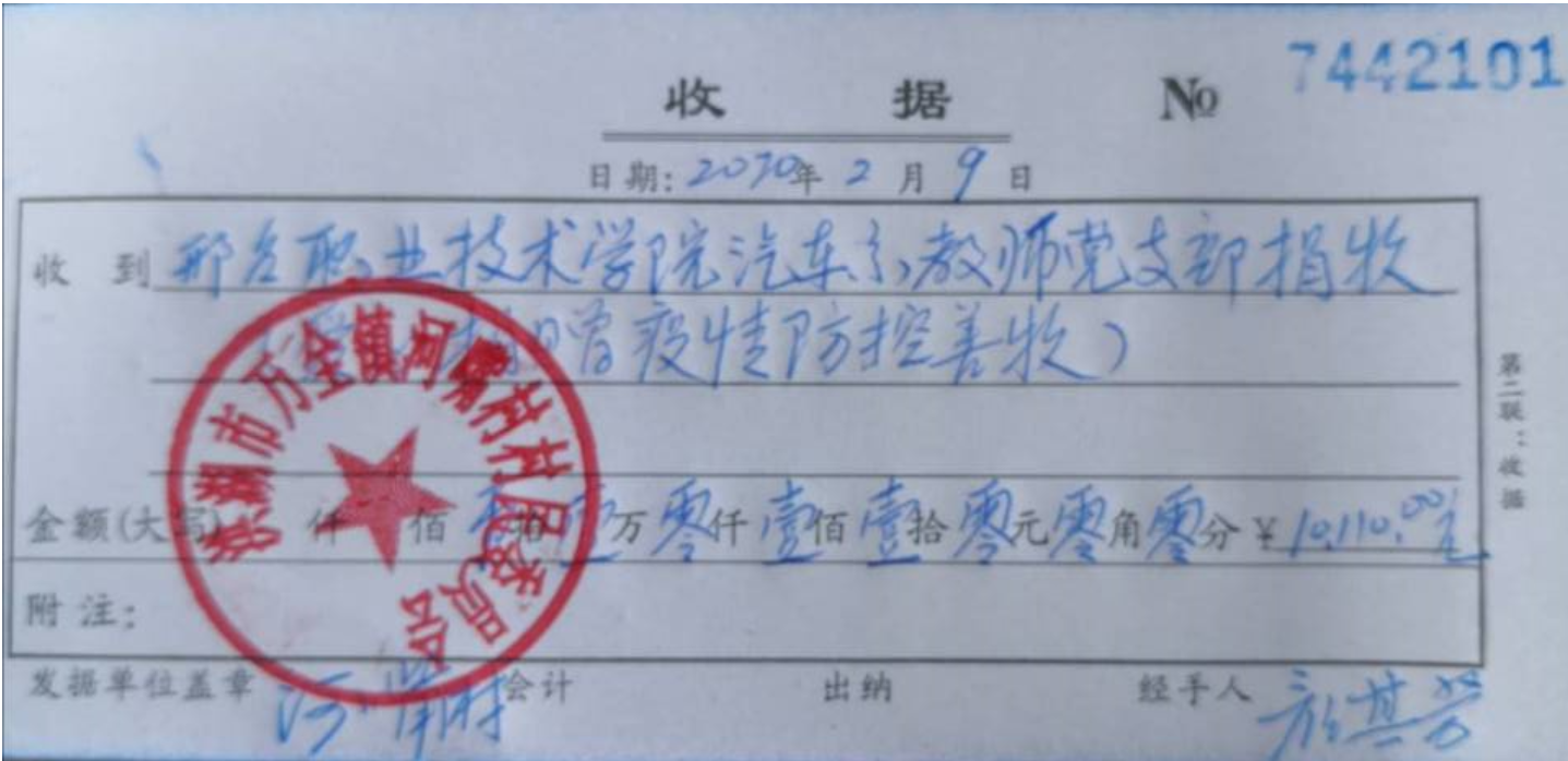面对新型冠状病毒感染肺炎疫情的严峻形势,汽车工程系教师党支部作为国家级、省级党建“双创”工作样板支部,积极响应国家号召,扎实完成学院疫情防控领导小组各项任务。全系党员凝聚人心,汇集战疫强大力量,自发捐款共计10110元,在关键时刻充分发挥基层党组织的战斗堡垒作用和党员的先锋模范作用。经过教师党支部书记李祥峰教授的多次联系,经全系教师同意,款项直接捐赠至疫情一线湖北省万全镇河嘴村。