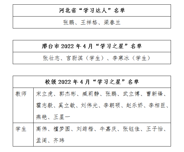 “学习强国”学习平台是中宣部主办的立足全党、面向全社会的科学理论学习阵地和思想文化聚合平台。经各地各单位逐级推荐、业务部门审核把关,best365张鹏等三名学员被河北省授予“学习达人”荣誉称号,张壮志等三名学员被邢台市授予2022年4月“学习之星”荣誉称号。同时,学校为进一步抓好“学习强国”学习平台推广工作,激发广大师生学习积极性,决定授予宋立虎等二十二名学员2022年4月份校级“学习之星”荣誉称号。