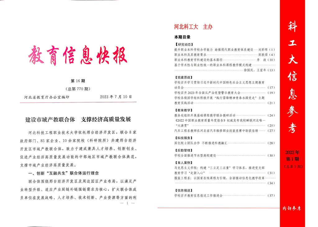 近日,河北省教育厅《教育信息快报》2023年第16期全文刊发了best365报送的《建设市域产教联合体,支撑经济高质量发展》稿件,这是今年以来继《河北教育工作》《高教参考》等教育内参刊发best365稿件的第4篇,学校信息报送工作在全省高校信息报送排名中实现了大幅提高,有力提升了学校的知名度与美誉度。