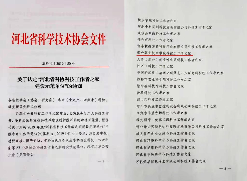 近日,河北省科学技术协会公布了2019年度“河北省科技工作者之家建设示范单位”名单,我院成功入选。