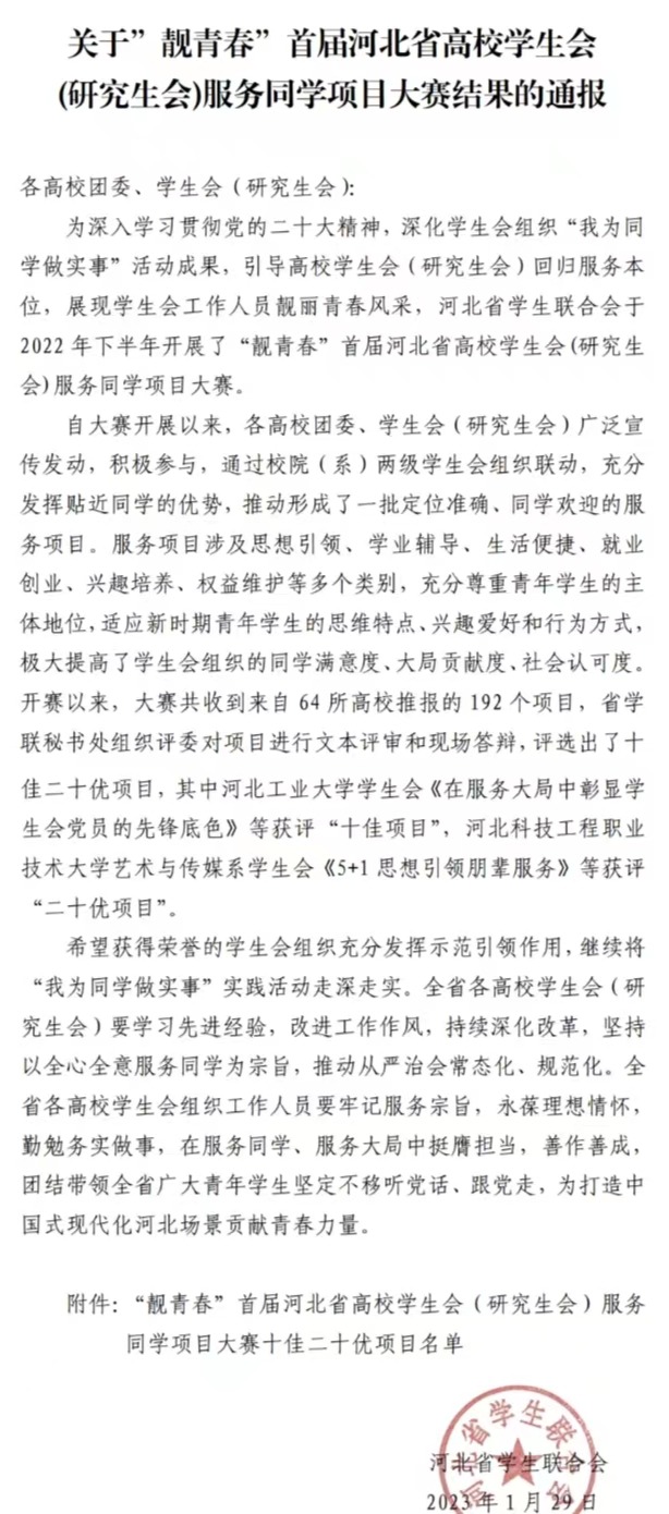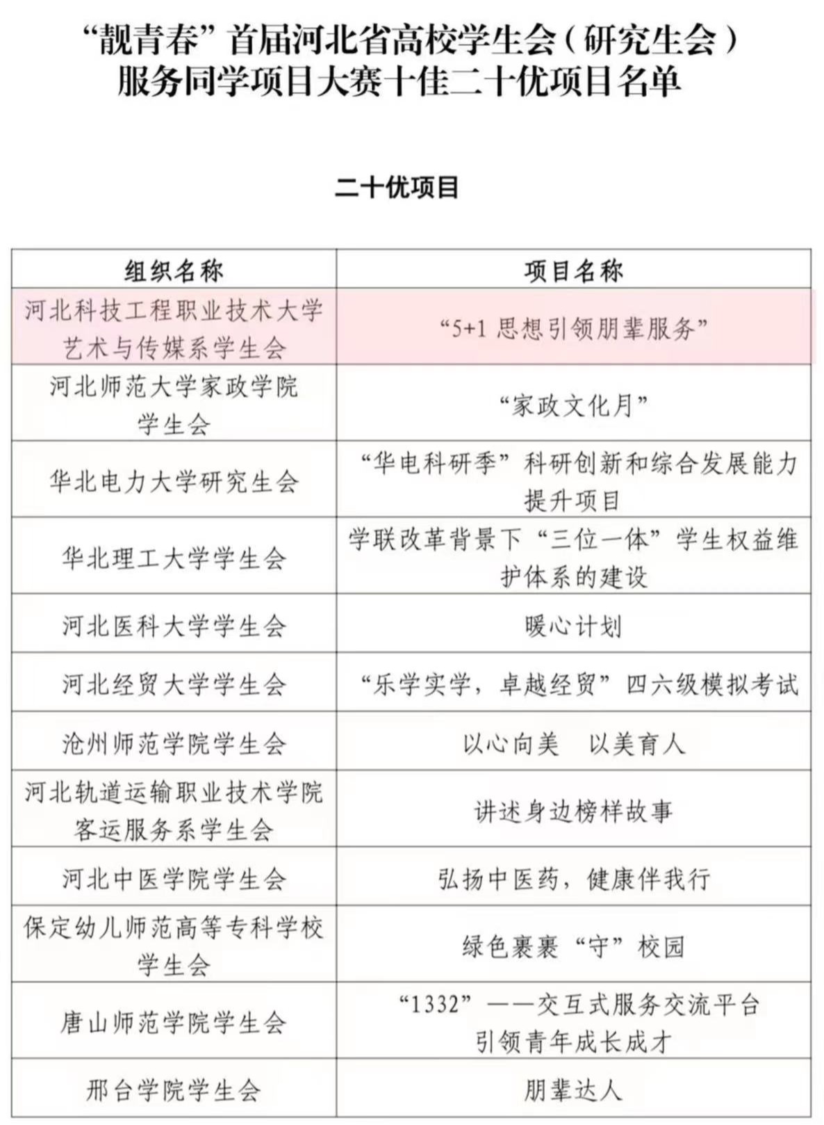近日“靓青春”首届河北省高校学生会(研究会)服务同学项目大赛结果揭晓,学校推荐的艺术与传媒系学生会“5+1思想引领朋辈服务”项目经过初赛、复赛、决赛在64所高校192个项目中脱颖而出,荣获二十优项目。