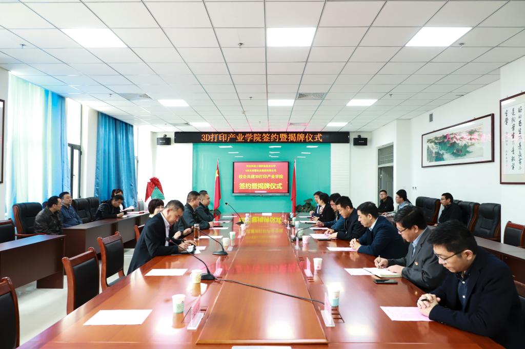 首先,马东霄院长、沈小武副总经理和杨军峰科长分别发表了讲话,祝贺校企共建的3D打印产业学院顺利成立。马东霄院长肯定了此次校企合作的模式,希望通过3D打印产业学院的成立,建立以政府为主导、企业积极参与、高职院校协作办学的“政校企”相结合的合作模式,实现高职院校与企业优势互补、资源共享,为区域内大中专院校和企业树立职业教育标杆。随后,李贤彬副院长和郝延鹏副董事长共同签署合作协议,马东霄院长和刘玉芬董事长为3D打印产业学院揭牌。揭牌仪式后,各位领导参观了机电系各实训室。